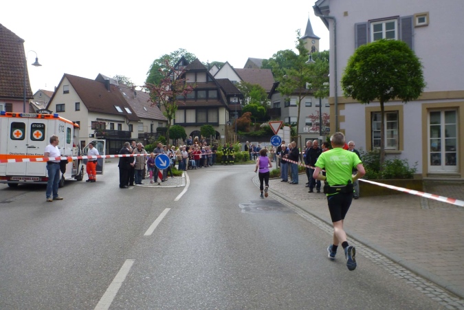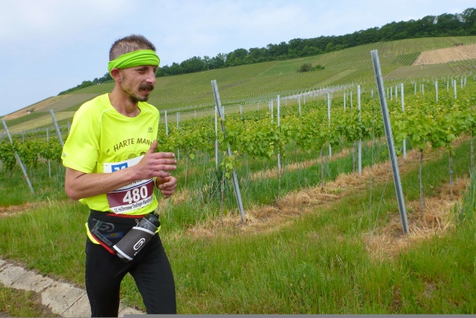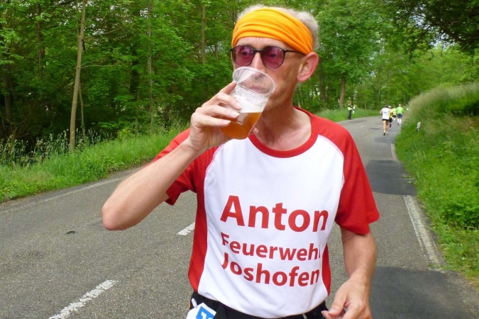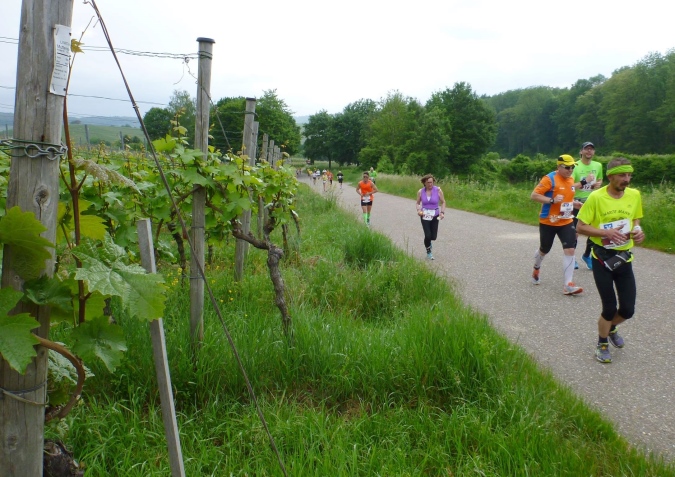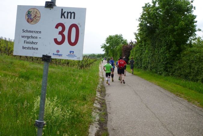 Eine kleine Hocketse (gemütliches Beisammensein) ist hier in vollem Gange. An der VP steht neben dem obligatorischen Wasser einsam ein Becher mit Rotwein. Gerade will ich danach greifen, da ruft die Helferin: „Vorsicht, das ist Weinschorle!“ Entsetzt ziehe ich die Hand zurück. Ich bin doch nicht 30 km gelaufen, um dann eine Schorle (mit Wasser verdünnter Wein) zu trinken. Flink springt ein Helfer auf und holt eine Flasche Wein aus dem Vorrat. Es ist Nordheimer Sonntagsberg Trollinger. Die Feiernden prosten mir zu. Dann laufe ich fröhlich weiter.