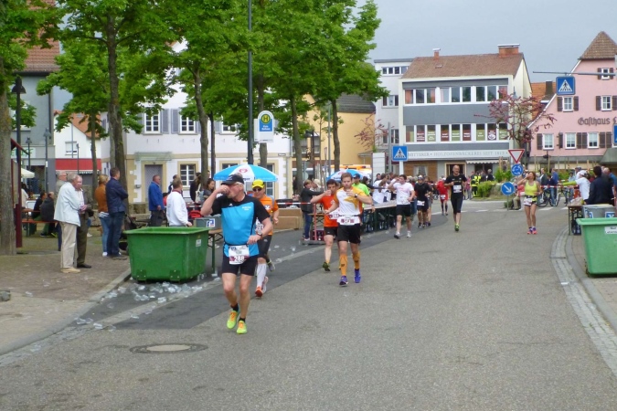 Lauffen hat historisch allerlei zu bieten: Siedlungsspuren aus der älteren Jungsteinzeit finden sich hier, Kelten, Römer, Bauernkriege, Österreicher, Napoleon sind weitere Stichworte. Aktuell bietet man einen Schotten auf, der auf der „Alten Neckarbrücke“ Dudelsack spielt, allen Unbilden des stärker gewordenen Nieselregens zum Trotz. Und endlich sehe ich auch eine Weinverkostung am Ende des Verpflegungspunkts. Die einzige offene Frage, die ich bei meinen Recherchen im Internet nicht klären konnte, ist damit beantwortet: Es gibt also den berühmten Trollinger auch an der Laufstrecke.
