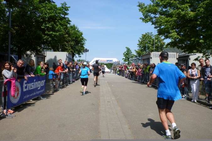 Ab jetzt machen wir mit den Halbmarathonis gemeinsame Sache. Vor mir der 2:15-Pacer. Eigentlich wäre es doch noch lustiger, wenn der 2:00-Pacer auf den 4:00-Pacer vom Marathon treffen würde. Die Straße ist breit, man kommt ohne Probleme an den „Halben“ vorbei. Km 40: Wir sind in Heilbronn-Böckingen. Nette Ecke und viel Remmidemmi. Unter der Bahn hindurch und dann noch ein letztes Mal über den Neckar. Unter dem Startbogen biegen wir bald ins Stadion ab. Auf blauer Tartanbahn fliege ich förmlich dem Ziel entgegen.