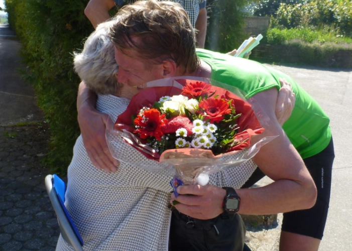 Schon mit etwas schweren Beinen erreiche ich Hausen, von weitem kann ich beim leichten Bergabstück eine größere Menschenmenge am Ende der Straße ausmachen. Dort erwartet mich in einer Kurve Bacchus, der Gott des Weines. Einen riesigen gefüllten Weinkelch streckt er mir entgegen. Da ich jetzt eine Pause und Stärkung gut vertragen kann, lasse ich mich nicht zweimal bitten. Es schmeckt hervorragend und die Leute applaudieren mir ganz begeistert.