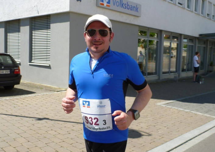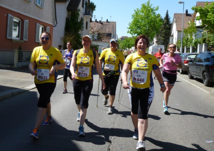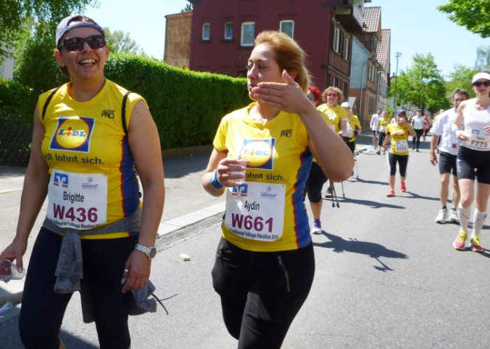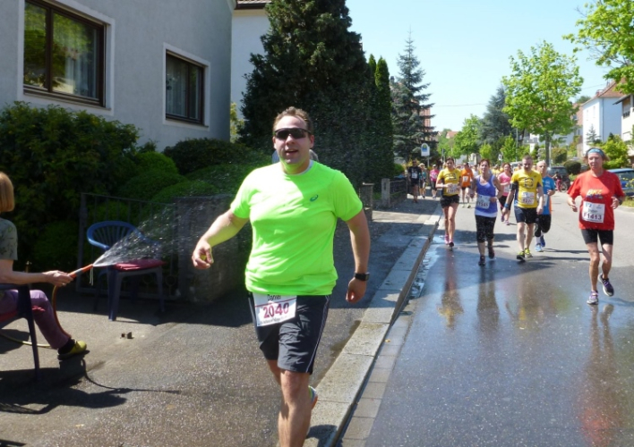 Weiter geht es durch den Wertwiesenpark, entstanden im Rahmen der Landesgartenschau 1985. Noch einmal Citymarathon-Feeling beim Durchqueren des Stadtteils Sontheim. Nach dem Restaurant „Zum lustigen Steirer“ erreichen wir den ersten Verpflegungspunkt. Der ist wie alle anderen perfekt auf beiden Seiten der Strecke angeordnet und ausgeschildert. Als Party-Hotspot immer auch mit Livemusik, was einem laufenden Fotoreporter einiges abverlangt: Banane im Mund, Becher zwischen den Zähnen, fotografieren und nicht so viel Zeit verlieren.