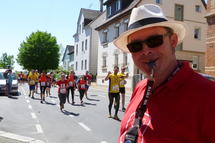 Nach dem Ort dann bei Kilometer die nächste Verpflegungsstelle. „Wasser! Wasser!“ und „Apfelschorle! Apfelschorle!“ rufen die HelferInnen laut und engagiert. Ganz so, als müssten sie die Getränke für viel Geld verkaufen. Ganz hinten am letzten Tisch sitzt dann eine Dame und ruft ganz verschüchtert „Trollinger!“. Ihr Angebot ist heute kaum gefragt. Sie weiß es: es liegt an der Hitze, nicht an der Qualität.