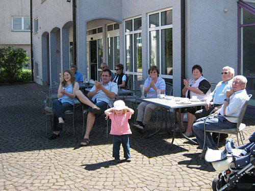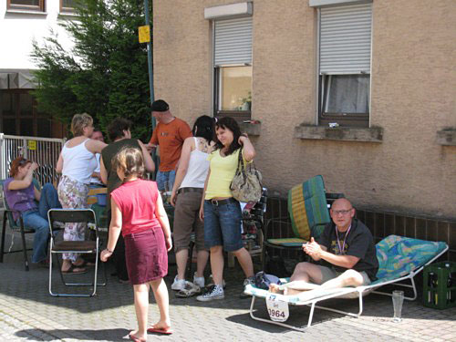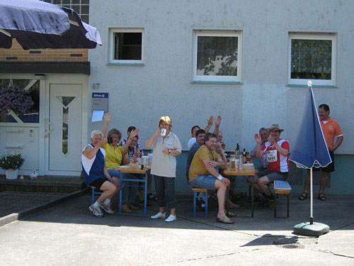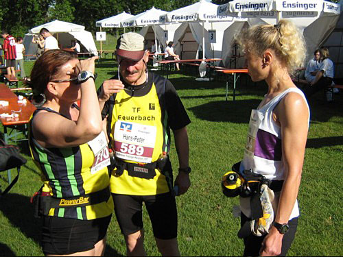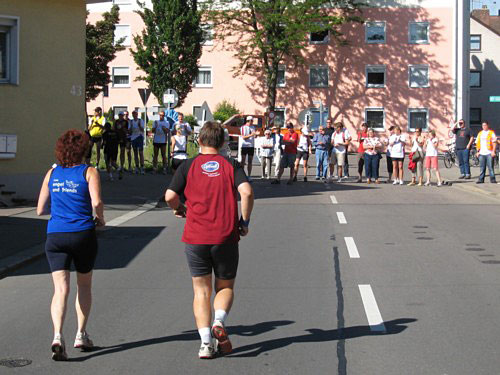 Etwa drei Kilometer liefen wir jetzt über Felder und Wiesen, bis wir 20 Minuten später Lauffen und wenige hundert Meter später die Verpflegungsstelle erreichten. Obwohl wir ganz im hinteren Feld liefen, empfingen uns doch noch eine Menge Zuschauer, die der Hitze trotzten und uns anfeuerten.