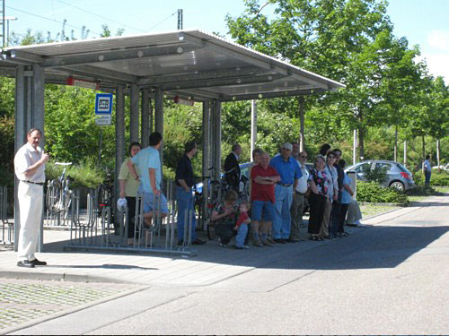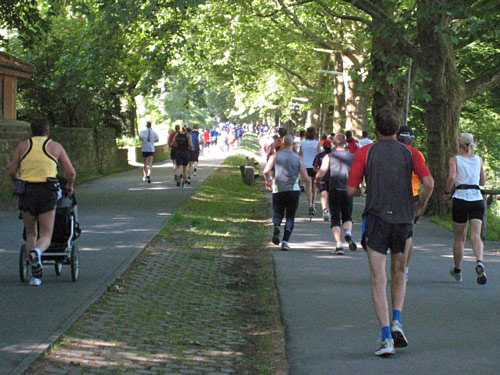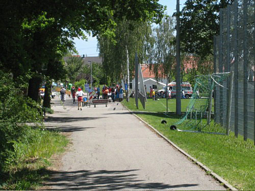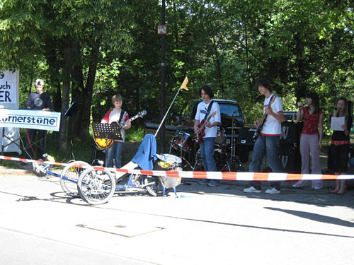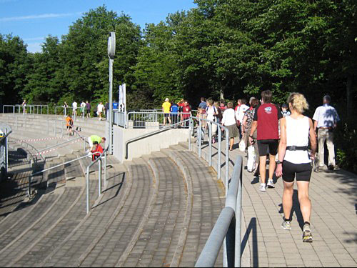 Aus dem Park verabschiedete uns eine Schülerband mit Rockmusik und weiter ging es durch den Vorort Sontheim, wo wir von Zuschauern mit Beifall empfangen und durch den Ort begleitet wurden. Noch in Sontheim erreichten wir bei Kilometer fünf die erste Verpflegungsstation. Zwar war es bereits um diese Zeit recht warm, aber Durst hatte ich noch keinen, also trank ich nur einen Becher Wasser und lief dann weiter.