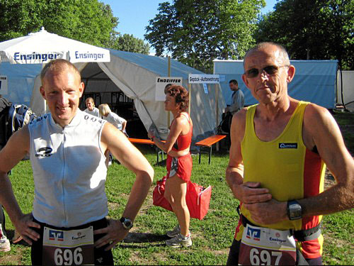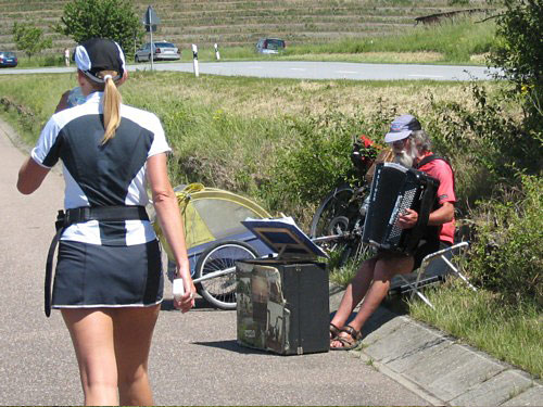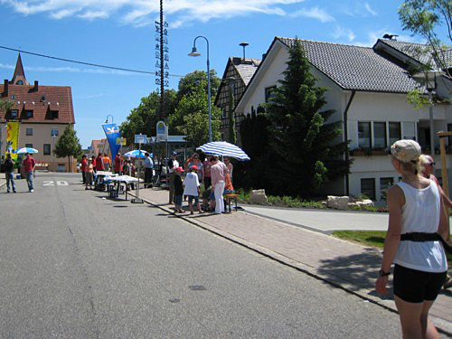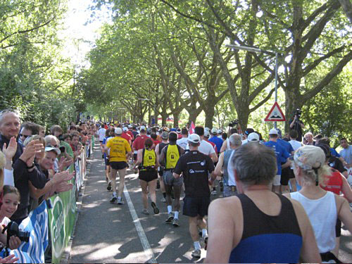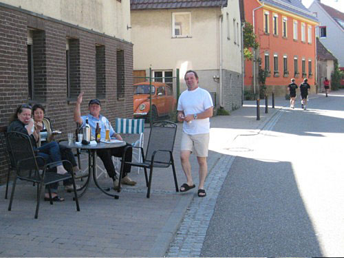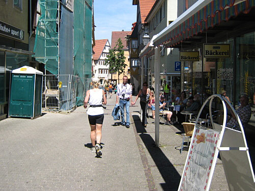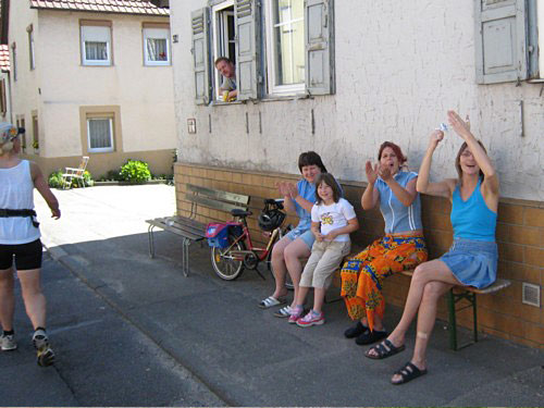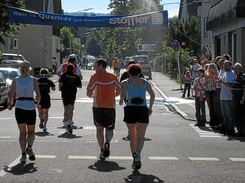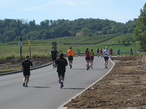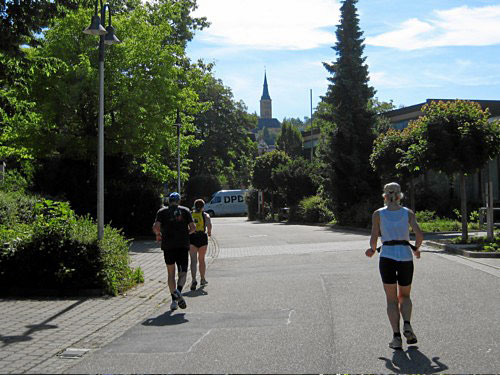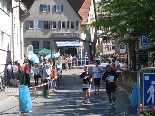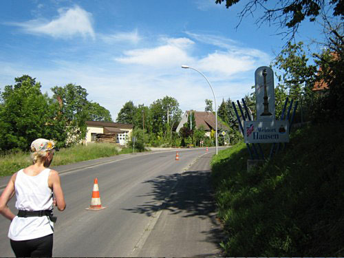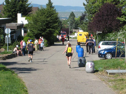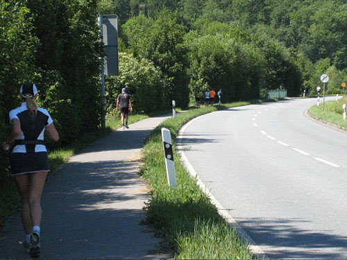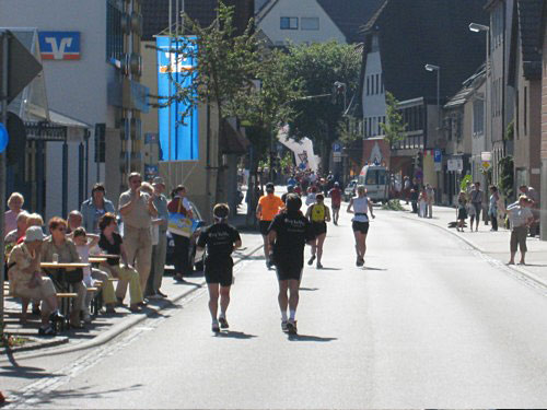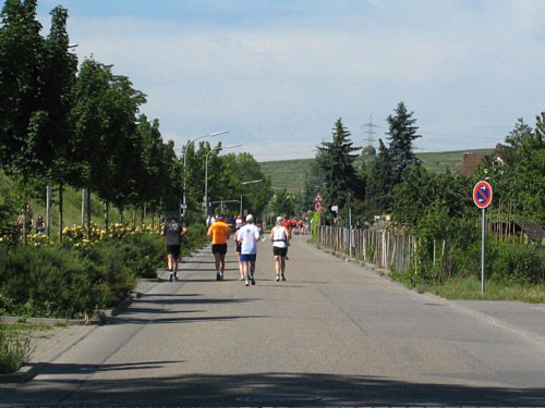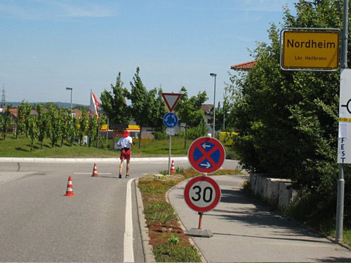 Wieder machte ich den Fehler, dass ich zuwenig trank; zwei Becher genügen bei diesen Verhältnissen nicht. Es ging mir aber noch gut, so dass ich unbeschwert weiterlief, hinüber über den Neckar, hundert Meter der Hauptstraße entlang und dann auf einer langen, sonnigen Geraden hinaus aus Lauffen, Richtung Hausen. Mittlerweile war es unangenehm warm geworden, so dass die Leute, die uns hier noch zuschauten und beklatschten, nahezu alle im Schatten standen.
