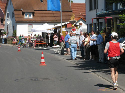 Mitten im Ort zweigte die Halbmarathonstrecke ab, so dass ab hier nur noch die Marathonis liefen. Frühestens aber in 75 Minuten würden hier die ersten Halbmarathonis durch den Ort kommen.
