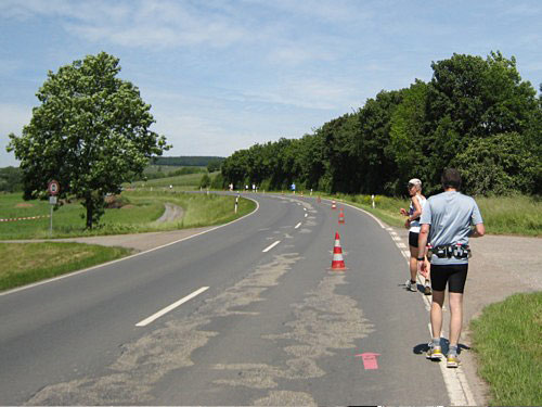Wir marschierten also entschlossen dem sonnigen Weg entlang, mussten ein paar ehrgeizige Marathonis vorbeilassen und hatten bei Kilometer 32 Nordhausen erreicht. Wenige Leute an der Wasserstelle, ein paar mutige Zuschauer im Schatten, ansonsten menschenleere Hauptstraße. Tja, das kenne ich auch anders aus den Vorjahren. Da lag ich aber mitten im Hauptfeld und die Hitze war nicht so stark.