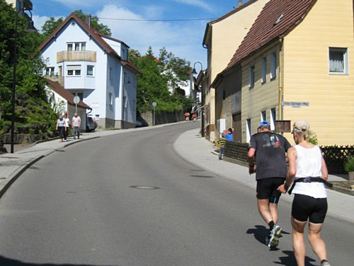 Mit mehr oder weniger flottem Schritt, abwärts auch langsam joggend, ging es weiter nach Neipperg. Allerdings lag da noch der berüchtigte Anstieg dazwischen. Bereits nach der ersten Veranstaltung 2001 aber war die Streckenführung geändert worden und der Anstieg damit entschärft. Hier kann man durchaus joggen, wenn man kann. Ich konnte nicht, kam aber mit flottem Gehschritt auch ganz flott hoch.
