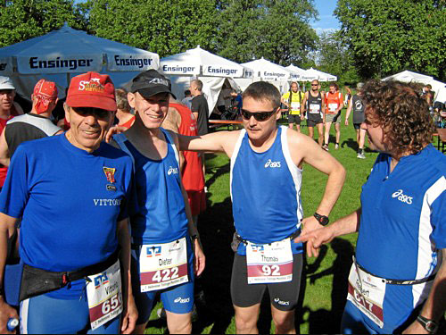 An der Verpflegungstelle bei Kilometer 39 bekam ich dann sogar noch einen halben Becher Cola, genauer ein Spezi. Mühelos konnte ich das in einem Zug trinken und machte mich frohgemut auf die letzten drei Kilometer bis ins Ziel, das wir nach 5:41 Minuten unter freundlichem Beifall erreichten.