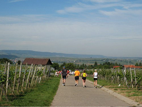 Jetzt kam der Abschnitt nach Brackenheim, den ich in schlechter Erinnerung hatte. Bei all meinen Teilnahmen war dies einer der Abschnitte, auf denen mir die Sonne am meisten zugesetzt hatte. Entsprechend vorsichtig ging ich den Abschnitt an; gehen musste ich noch nicht, aber noch etwas langsamer joggen. Sorgenvoll schaute Angelika immer wieder zu mir zurück, hatte sie doch bemerkt, dass mir der Lauf zunehmend mehr Mühe machte und kaum noch hinter ihr herkam.