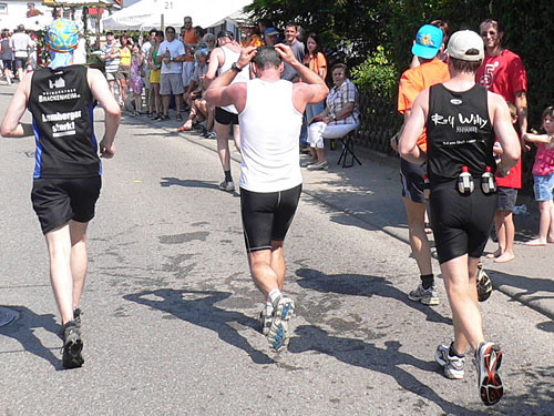 Am Ende von Nordheim, am letzten schweren Anstieg, sehe ich einen Mitläufer, der mich schon mehrmals überholt hatte. Leute am Rand feuern ihn an, aber es geht nichts mehr. Er meint, es sei zu heiß, dreht den Kopf zu mir und sagt: "Isse zu heiße - Isse Scheiße." Sagt’s, schaut wieder nach vorne und geht mit mir zusammen bis oben hin. Der Ortsanfang von Klingenberg liegt unendlich weit weg..... Plötzlich läuft mein ebenso kaputter Vordermann los. Was, wie? Jetzt sehe ich unter einem Sonnenschirm am Wegrand ein Teleobjektiv mit Fotograf daran. Also gut, bis das Bild gemacht ist, laufe ich dann eben auch.