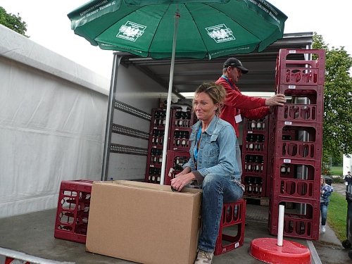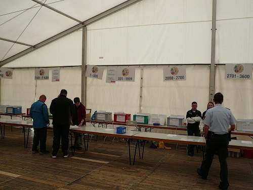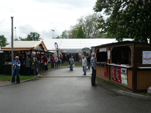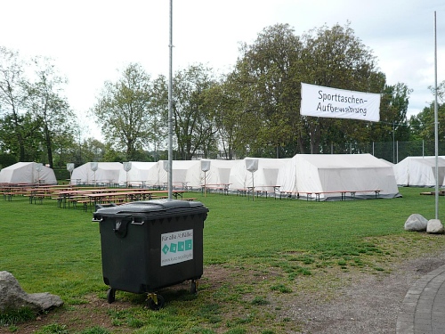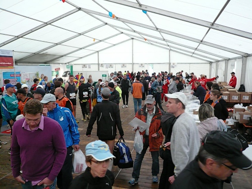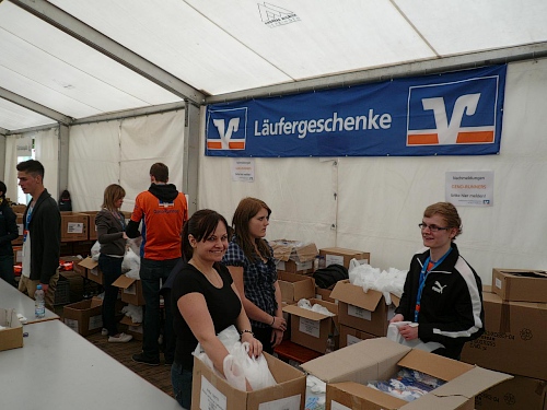 Am Festgelände ist schon alles aufgebaut. Im großen Festzelt finden wir eine kleine Messe und die Startnummernausgabe (keine Wartezeit). Als Zugabe erhalten alle Gemeldeten Funktionsshirt, ein paar Laufsocken der führenden Genossenschaftsbank sowie ein gutes Tröpfchen in Trollinger-Qualität vom hiesigen Wartberg. Vorschlag: Da könnte man ja schon am Vortag einen Probeausschank organisieren, damit wir wissen, was uns für die Degustation am Wettkampftag erwartet. Ich hätte schon zugegriffen, vielleicht auch Joe, Bernie sicher.
