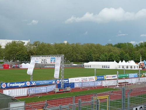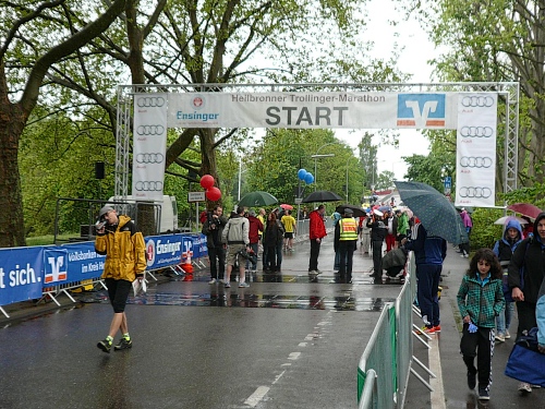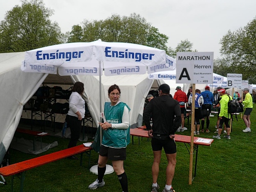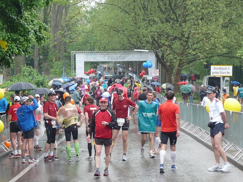 Petrus bleibt grantelnd, denn es pieselt munter weiter, als ich das Frankenstadion zu Fuß erreiche. Und die Socken in den Schuhen sind bereits feucht. Ich lasse mir Zeit und gehe erst gut zehn Minuten vor dem Einsatz in den Startbereich. Dort ist um 08.45 der Start für die Marathonis. Gut 1,5 Stunden später gehen die Halben auf die Strecke. Es wird ein Blockstart organisiert, der auch von den Ordnern überwacht wird. Während die Blocks der Halben zeitversetzt auf die Strecke gelassen werden, ist das bei den rund 600 Läufern des Marathons nicht nötig.