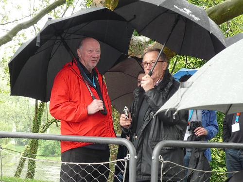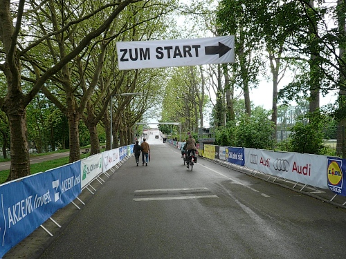 Die Masse der Läufer kommt erst in den letzten Minuten aus den trockenen Verstecken. Auf einem Podest steht bereits der Oberbürgermeister Helmut Himmelsbach, der zum ersten Mal seine Schirmherrschaft mit einem Regenschirm übernehmen muss. (Schirm)Herrschaft(szeiten)! Der Herr OB macht dann seine Sache gut, als er uns mit einem Schuss aus dem Startgerät losschickt.
