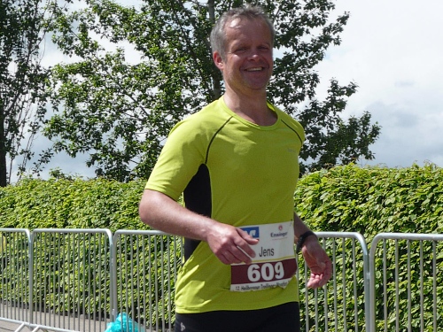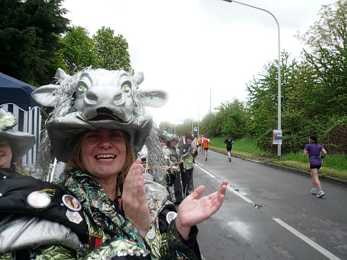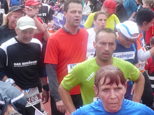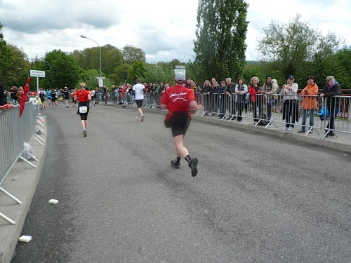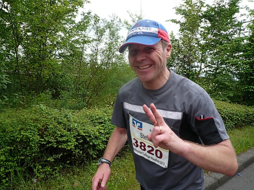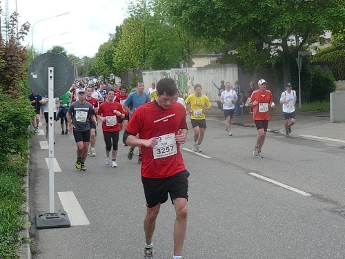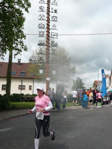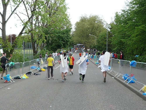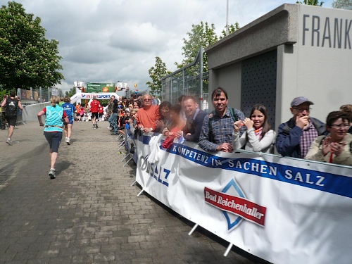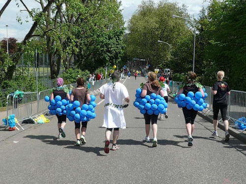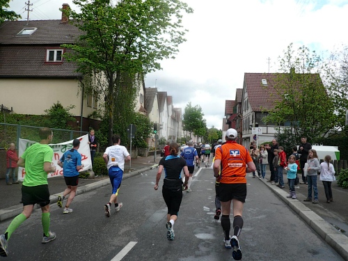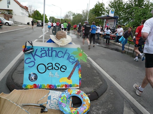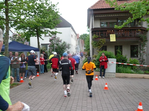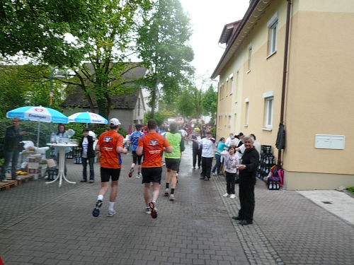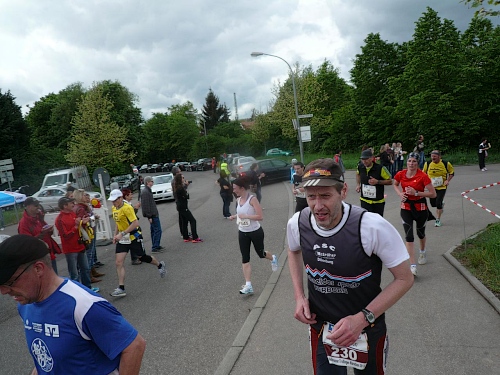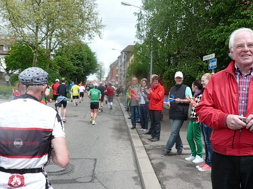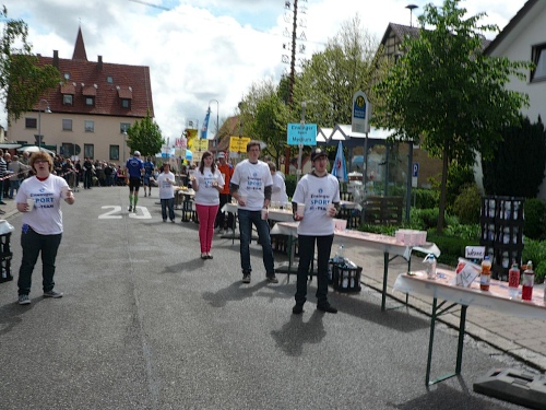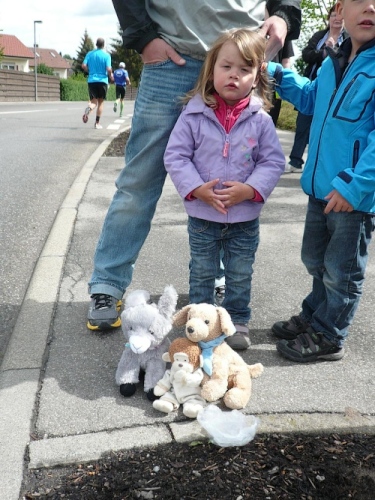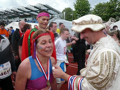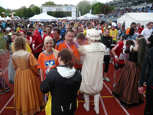 Renate aus Offenburg ist hier, Olaf will abgeklatscht werden, viele Verkleidete laufen ein, der Herr Bundesinnenminister Dr. Hans-Peter Friedrich rennt den Halben, Keule Klaus läuft mit Karlheinz zusammen, und, und, und. Auffällig viele Firmenangehörige von Lidl, Kaufland, Audi und der Raiffeisen Volksbank nehmen teil. „Der letzte muss das Regal morgen einräumen,“ dieser Spruch an die Adresse von Lidl-Läufern und ein „im leichten Schweinsgalopp ins Ziel“ sorgen für Lächeln und Gelächter bei Zuschauer und Sportlern. Da muss ich wieder her.