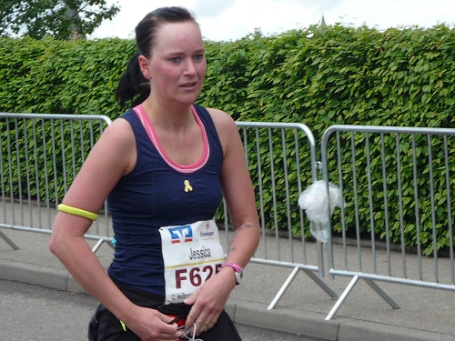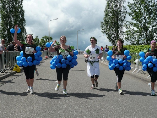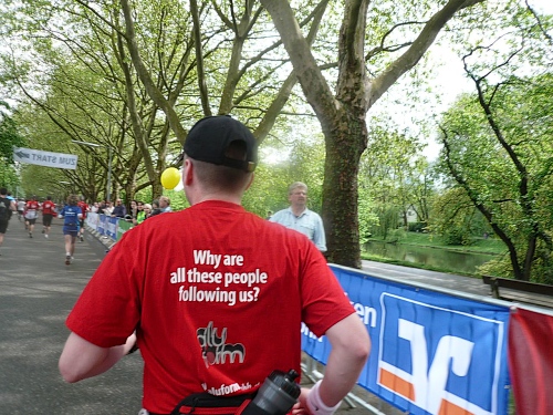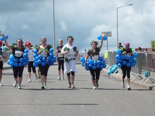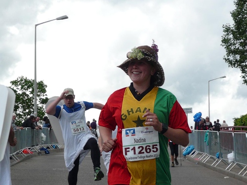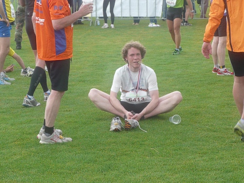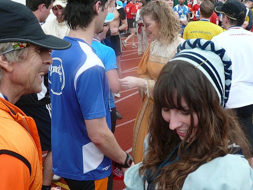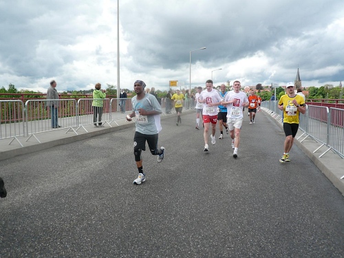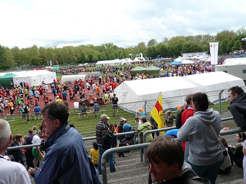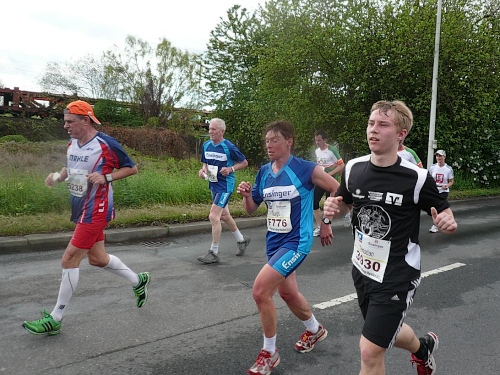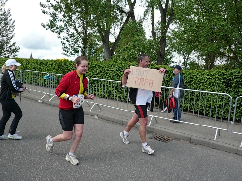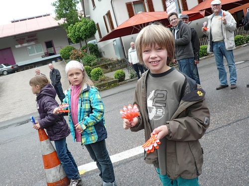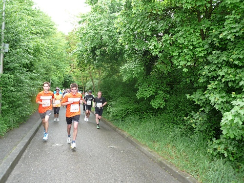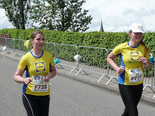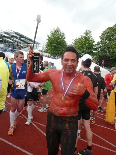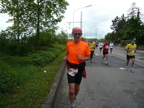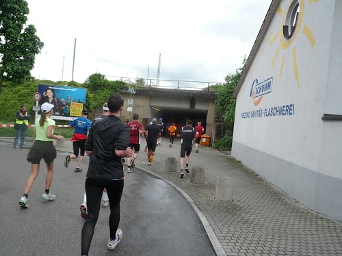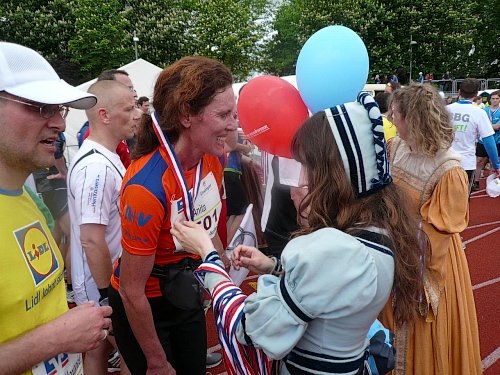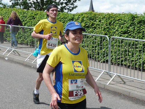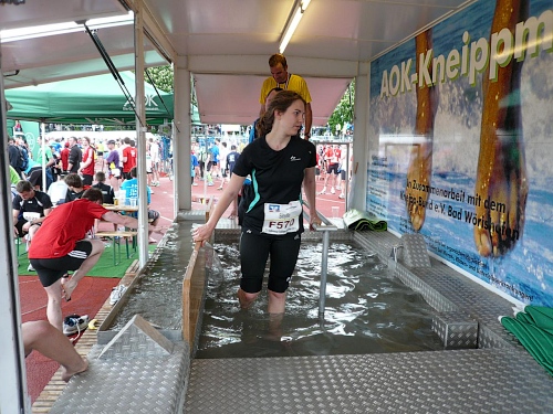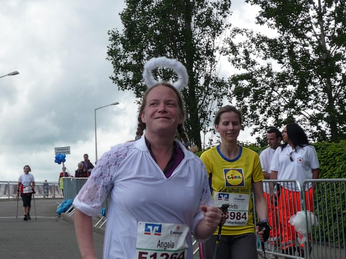 Renate aus Offenburg ist hier, Olaf will abgeklatscht werden, viele Verkleidete laufen ein, der Herr Bundesinnenminister Dr. Hans-Peter Friedrich rennt den Halben, Keule Klaus läuft mit Karlheinz zusammen, und, und, und. Auffällig viele Firmenangehörige von Lidl, Kaufland, Audi und der Raiffeisen Volksbank nehmen teil. „Der letzte muss das Regal morgen einräumen,“ dieser Spruch an die Adresse von Lidl-Läufern und ein „im leichten Schweinsgalopp ins Ziel“ sorgen für Lächeln und Gelächter bei Zuschauer und Sportlern. Da muss ich wieder her.