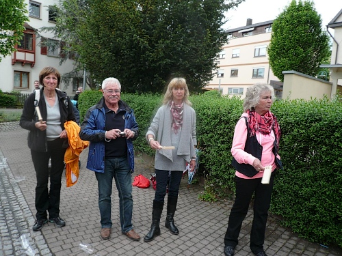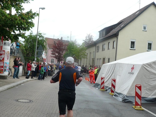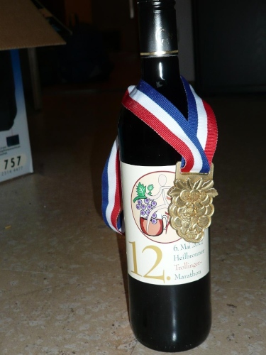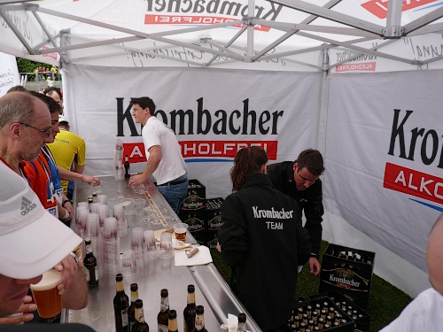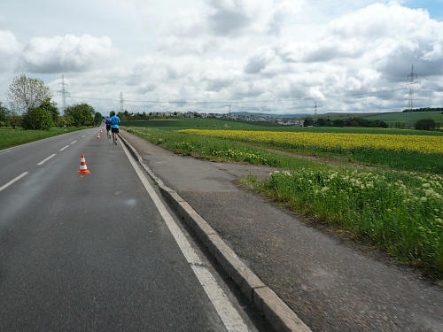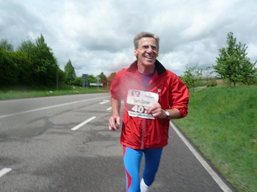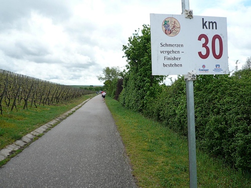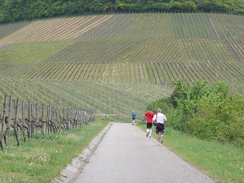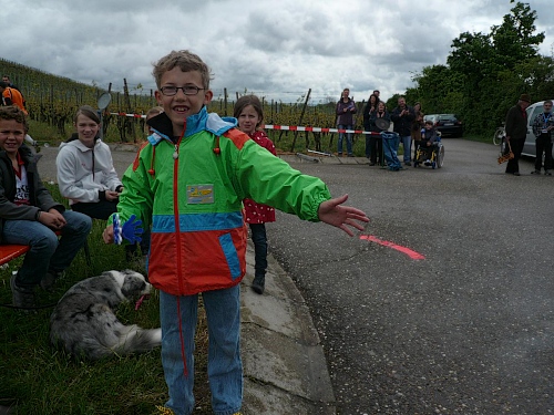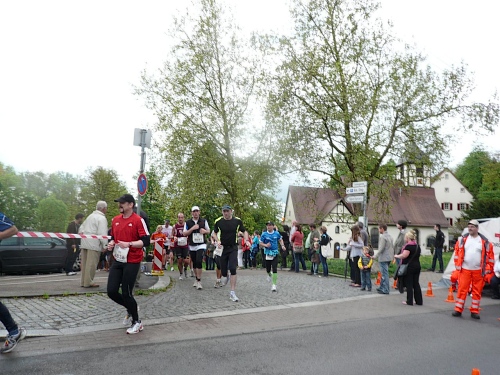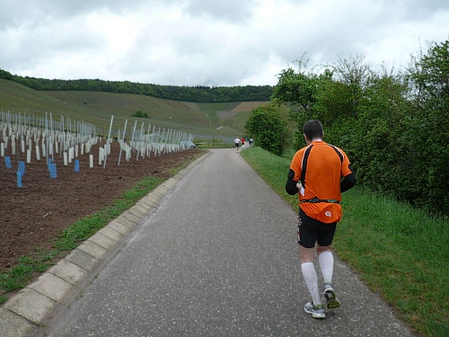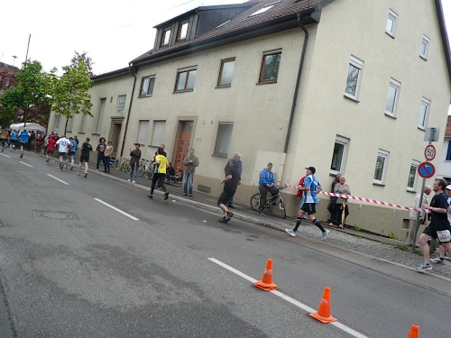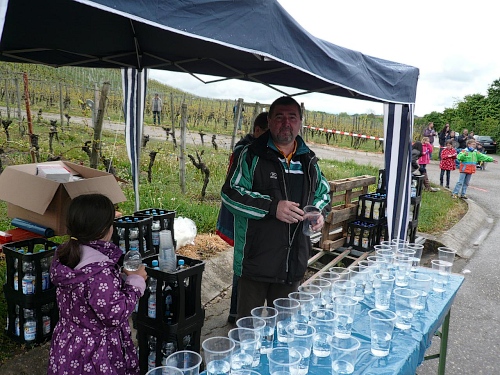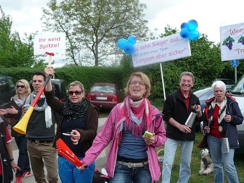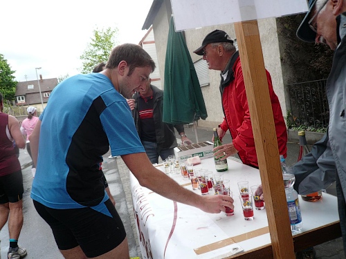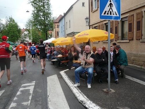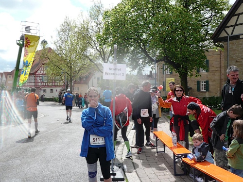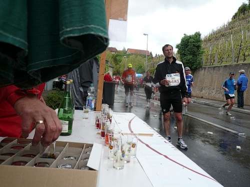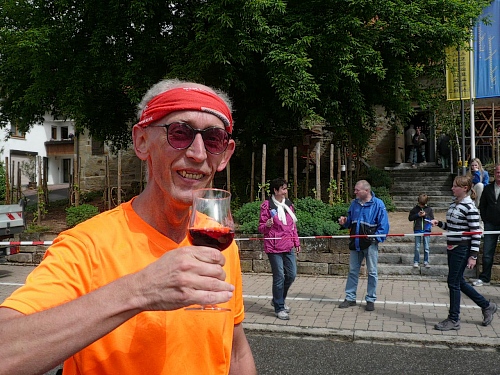 Mittlerweile haben sich die Wolken fast verzogen, es wird deutlich wärmer und unter der Windjacke schwitze ich fast wie ein Bock. Ich ziehe das schwarze Kleidungsstück aus. Jetzt ist es mir schon viel angenehmer. Für meine Weinseligkeit kommt mir der Weinausschank in Nordheim recht entgegen. Stilgerecht wird uns hier was eingeschenkt. Keine Watschen, sondern edler Roter in einem Glas. Da lass ich das Colagetränk zur Hälfte zurückgehen. Der erstmals durchgeführte Staffelwettbewerb zu Dritt wechselt auf den Schlussläufer.