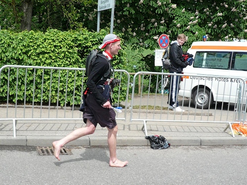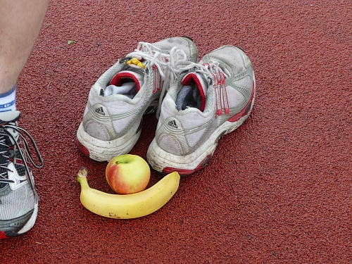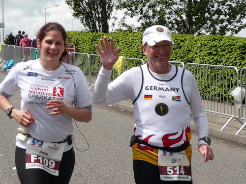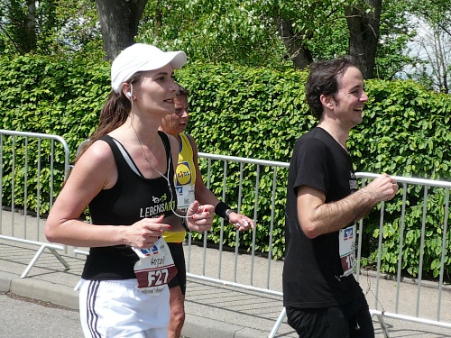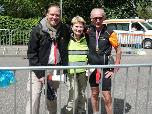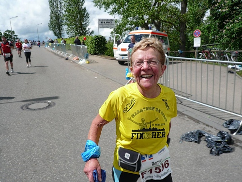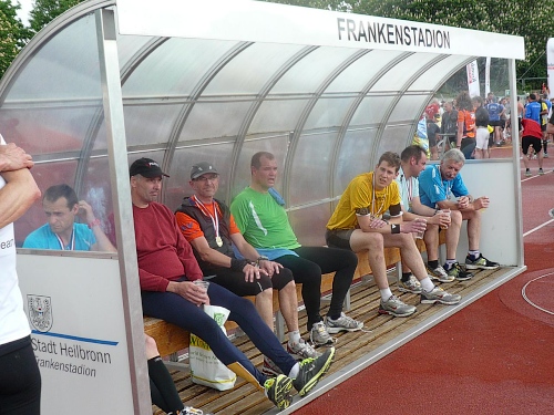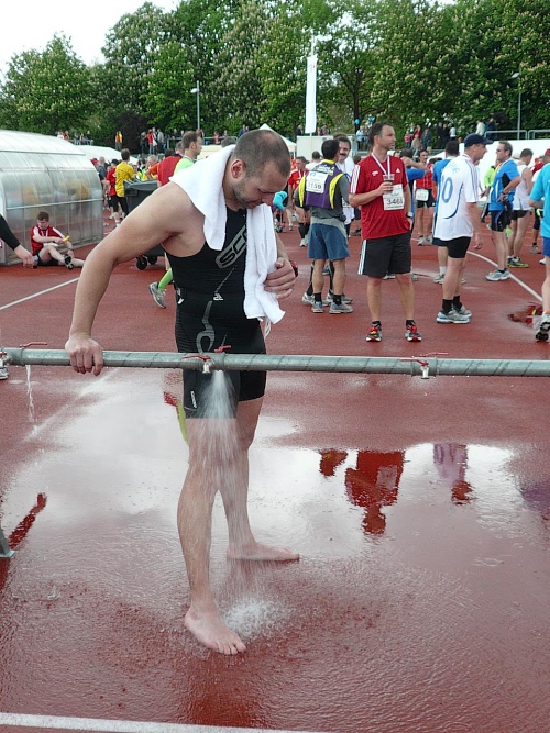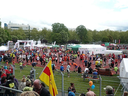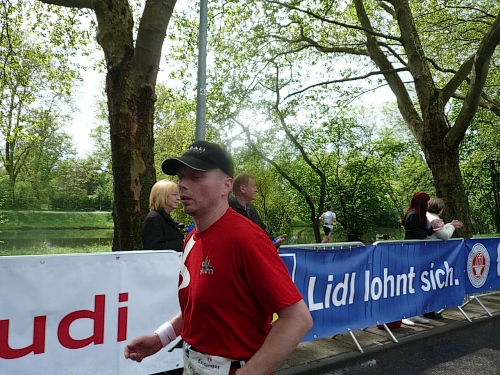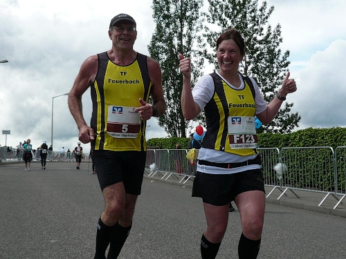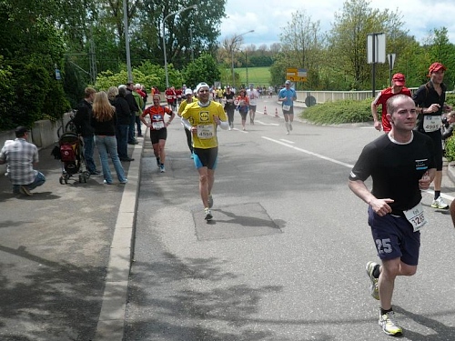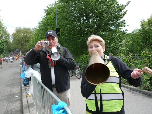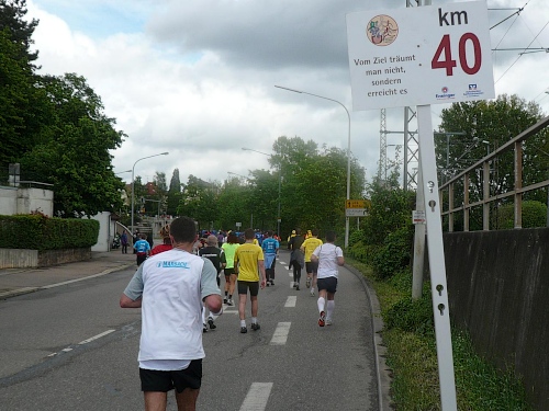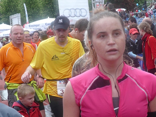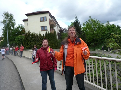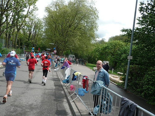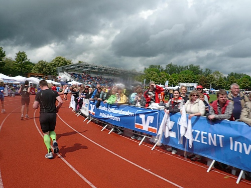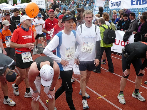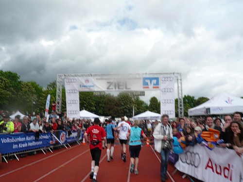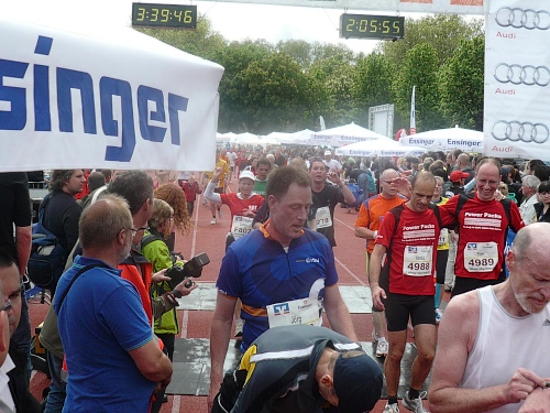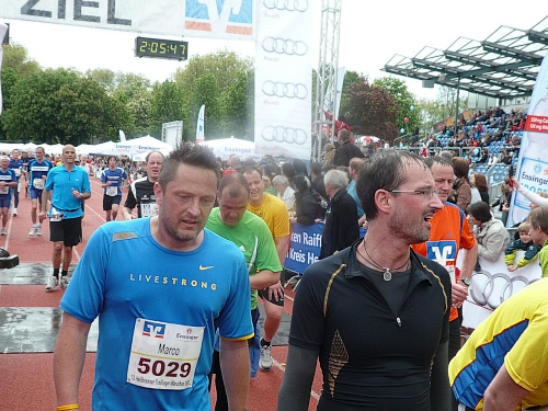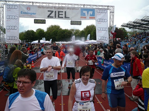 Die letzte Steigung (ein paar Höhenmeter) sind auf der Badstraße zu bewältigen. Und dann stehen Marcus und Topsi am Rand, ausgerüstet mit Megaphon und Flüstertüte. „Nicht vergessen, da vorn links in Ziel abbiegen,“ so schicken sie mich auf die letzten Meter. Auch wenn jetzt die Muskeln fürchterlich jodeln und jaulen, nach den 100 Metern auf der Tartanbahn im Frankenstadion ist einer der schönsten regionalen Marathons leider zu Ende. Fast auf die Minute habe ich die gleiche Zeit wie in Zürich.