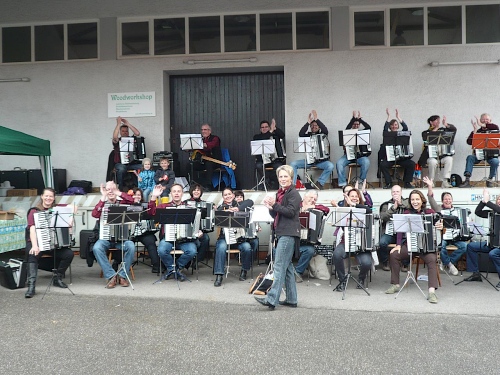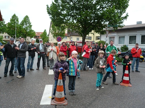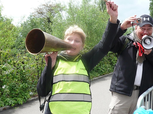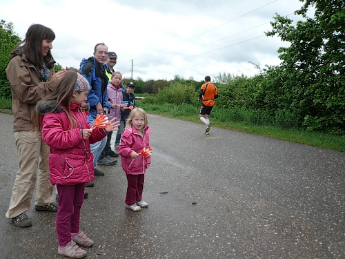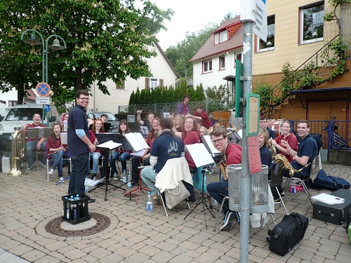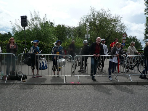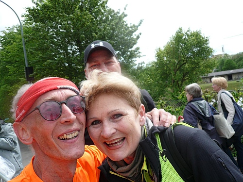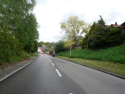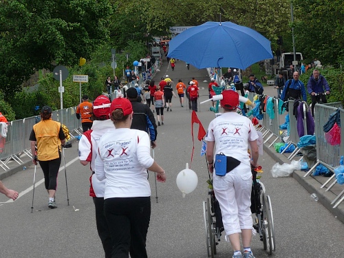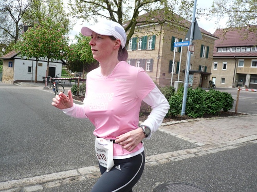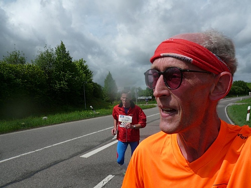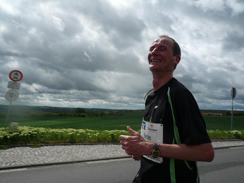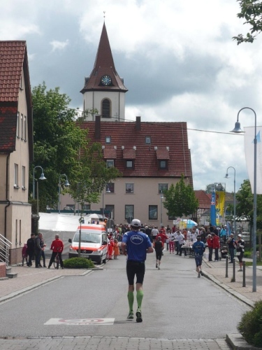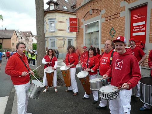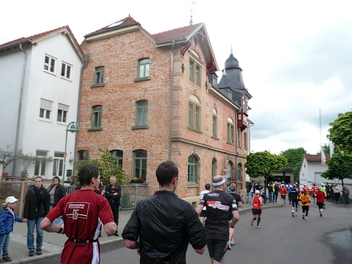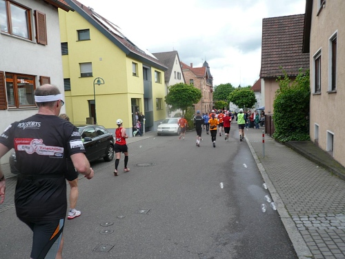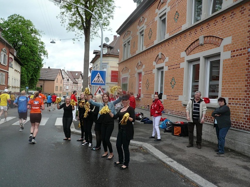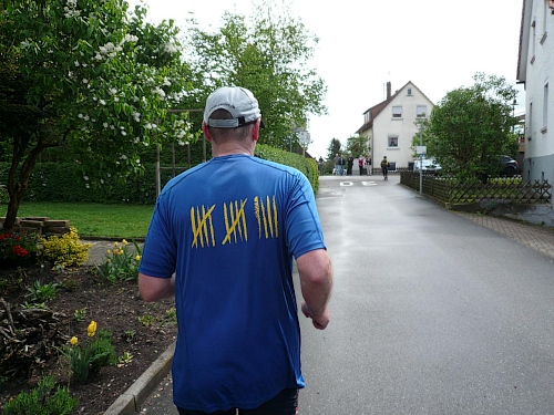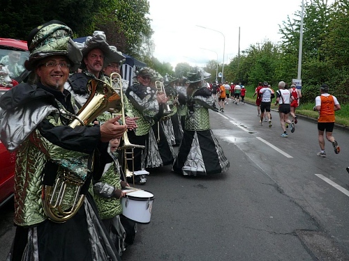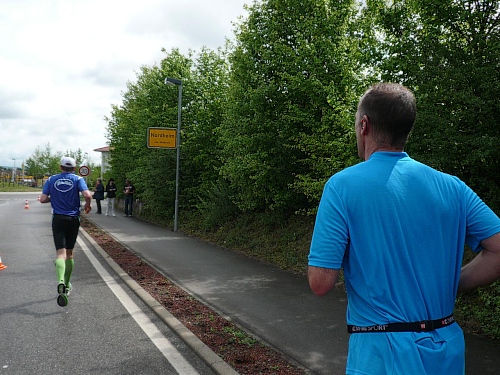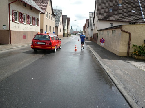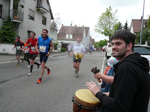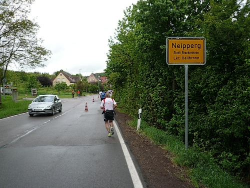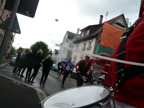 Zwei Drittel sind geschafft, lese ich auf dem 28. Längenmaß, die Ausläufer von Neipperg sind schon zu sehen. Viele Zuschauer geben uns bei unserm Durchlaufen einen Motivationsschub. Die Musikkapelle hat gerade Pause, klatscht aber begeistert, als ich meine Kamera einsetze.