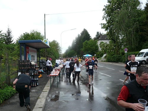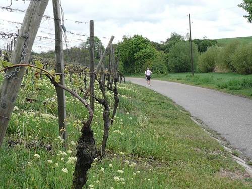 800 Meter Gefälle mit 10 Prozent führt uns hinunter in die Ortsmitte, wo von rechts die Halbmarathonstrecke einmündet. Und schlagartig ist der Kurs voll, aber nicht übervoll. Ein Rollen ist weiterhin möglich, aber nicht mehr bei mir. Eher ein Dahinschleichen. Da kommt die erneute Wein-Oase mit Rotem, Rose und Weißem gerade recht. Ein anderer Läufer verhandelt erfolgreich mit dem Winzer über das Mitnehmen des Weinglases.