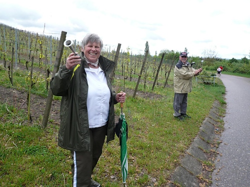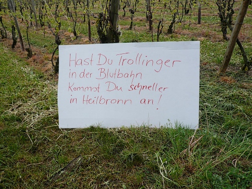Fast parallel zum Hinweg auf der Kreisstraße führt uns nun der Rückweg durch die Weingärten, mit gefälliger Tendenz. Dann muss ich lautstark brüllen, als ein Schild besagt: „Hast du Trollinger in der Blutbahn, dann ...“ Schaut Euch die zweite Zeile dazu an. Die vier, fünf Kilometer durch die Natur sind mit die schönsten an heutigen Tag.