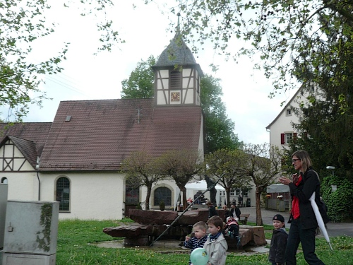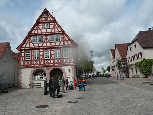 Nordheim hat alles, was ein ländlicher Ort braucht: Oberhalb der Hauptstraße die Bartholomäuskirche, den Maibaum mit vielen Zunftzeichen, Fachwerkhäuser. Ob es hier auch den Brauch des Maibaumverziehens gibt? Ich werde mich kundig machen. Fast eben führt uns nun der Kurs bis Klingenberg, das schon zum Stadtgebiet Heilbronn gehört.