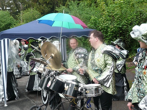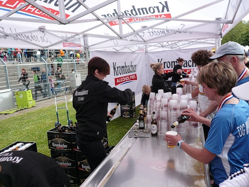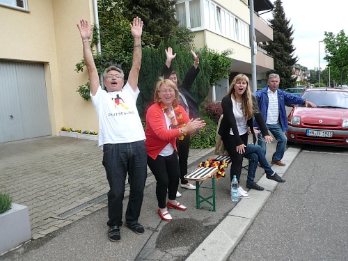 Nach dem kurzen Aufenthalt im Verpflegungsbereich mit Krombacher Bier, mehr brauche ich jetzt nicht, gehe ich wieder hinaus zu Marcus und Topsi. Die beiden machen Stimmung über Stunden und haben es in der Vergangenheit gleich mehrmals in die Lokalpresse geschafft. Ich sehe viele glückliche Gesichter und auch den einen oder anderen, der weinselig die Badstraße hinunterzog. Einer singt „So ein Tag, so wunderschön wie heute“.
