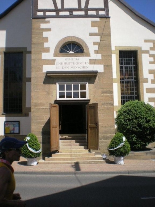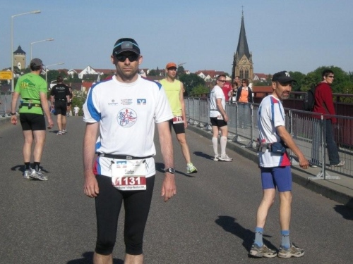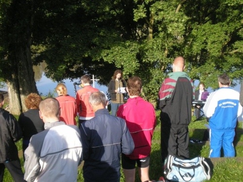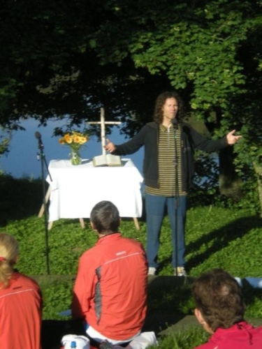 Eine Stunde vor dem Start versammelt sich am Neckarufer eine Gruppe von Teilnehmern zur traditionellen Morgenandacht. Schön, dass die Kirche Verständnis hat, dass aus triftigen Gründen sportliche Leute heute Morgen anderweitig anzutreffen sind. So kommt die Kirche halt zum Trolli. Sie ist nicht nur einfach präsent, sondern ist Teil des Marathons. Die Andacht hat einen direkten Bezug zum Lauf. Kein Wunder: Holger Stähle wird eine halbe Stunde nach der Andacht selber im Startblock stehen und das erste Mal über diese Distanz in ein Rennen gehen.
