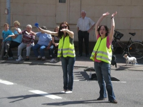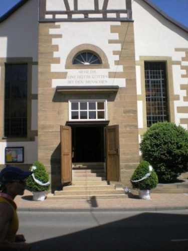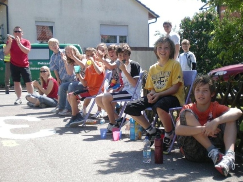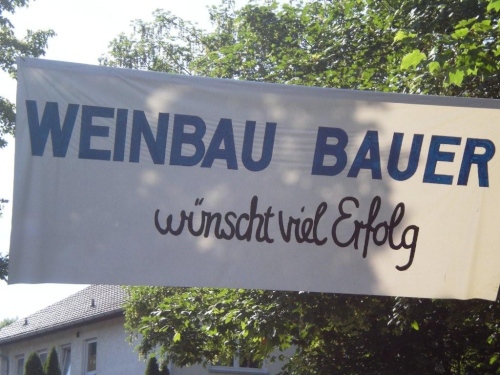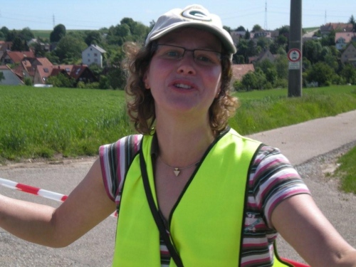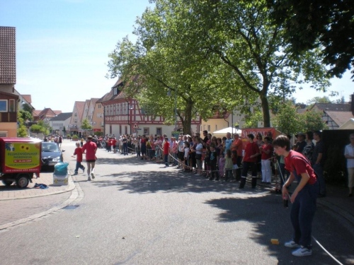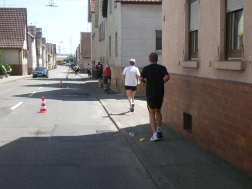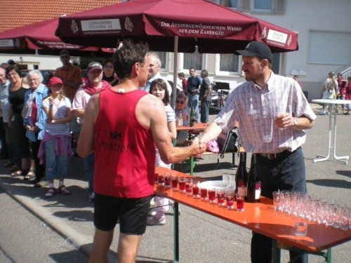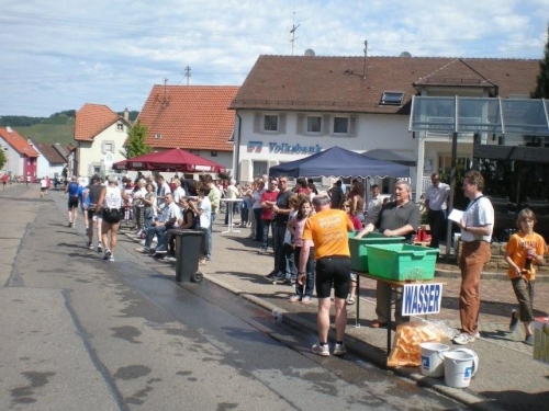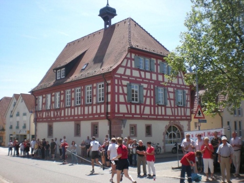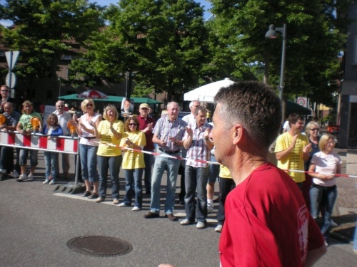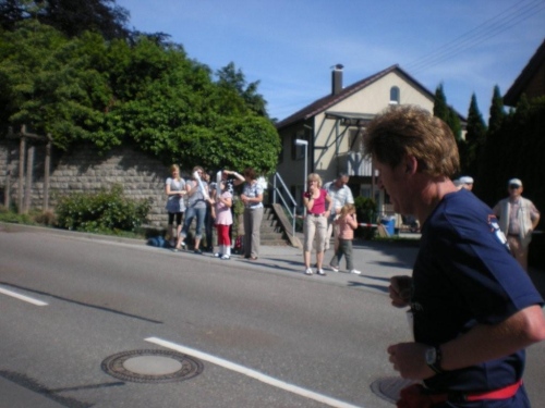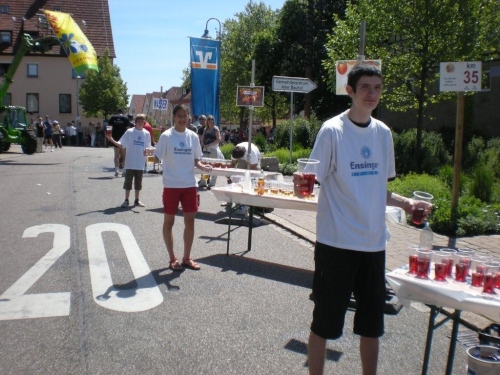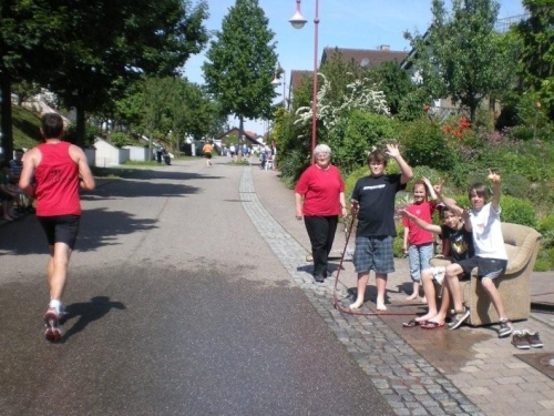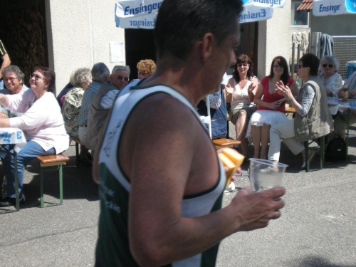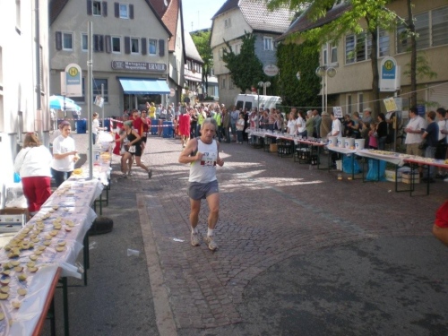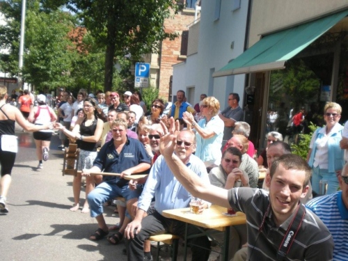 So schön der Weg durch die Weinberge eigentlich ist, bin ich ganz froh, endlich Nordhausen vor mir zu sehen und zu wissen, dass am Ortseingang nicht nur eine Festwirtschaft für Zuschauer, sondern auch eine Wasserstelle für uns ist. Nordhausen wurde vor gut dreihundert Jahren für vertriebene Waldenser gegründet und gilt als jüngste Siedlungs-Neugründung des Landkreises Heilbronn. Ich überlege mir, ob ich nicht hier vorübergehend sesshaft werden soll, während ich mich - wie alle anderen meiner Leistungsstufe - von Hausschatten zu Hausschatten vorkämpfe.
