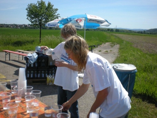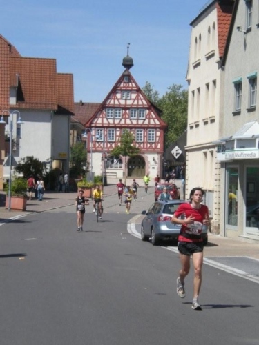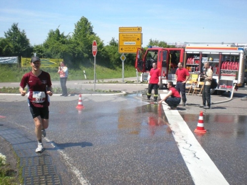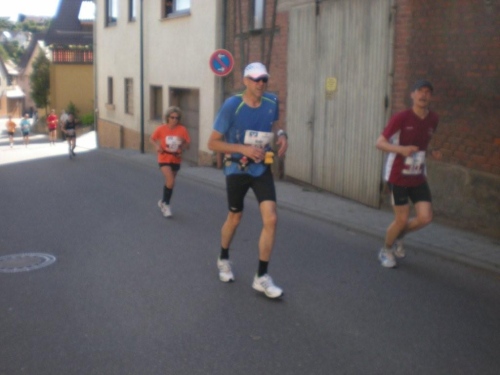 Die nächste Verpflegungsstelle liegt mitten in Nordheim und ich kann sowohl Tranksame als auch die enthusiastischen Anfeuerungsrufe der Zuschauer bestens gebrauchen. Das lockere Traben war vergangenen Sonntag, im Moment fühle ich mich wie ein alter Ackergaul, der – passend zum Wappen der Stadt -eine Pflugschar hinter sich herzieht. Damit nicht genug, es gibt nochmals eine Steigung. Am Straßenrand erbarmen sich die Zuschauer und verhelfen uns mit Gartenschlauch, Wasserpistolen und gefüllten Eimern zu Abkühlung. Leider muss ich auf fast alle Angebote verzichten, weil sonst meine Fotoreportage baden ginge.