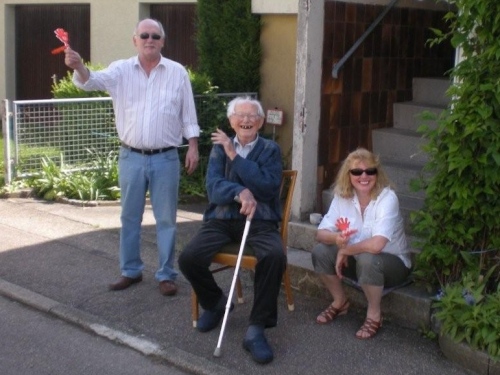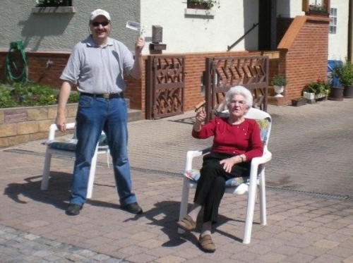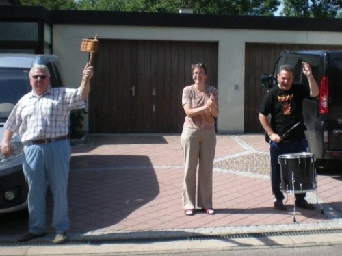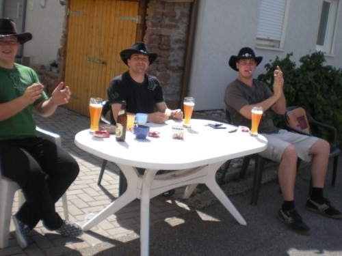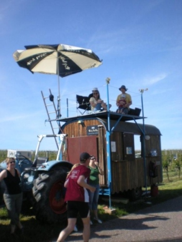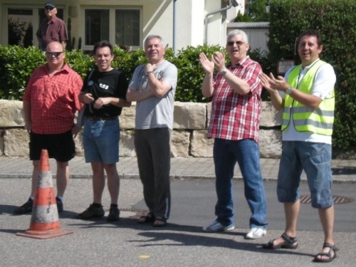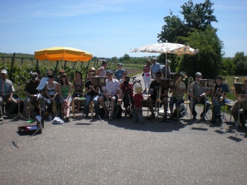 In den von der Sonne verwöhnten Weinbergen kommt uns jetzt wenigsten ein leicht kühlendes Lüftlein entgegen und das Kilometerschild verspricht, dass wir nur noch das letzte Dutzend vollzumachen haben. Auch der Posaunenchor Dürrenzimmern, die musikalische Verabschiedung von der Brackenheimer Gemarkung, macht Pause und scheint durch mein Fotografieren irritiert. Entweder kennen sie m4y nicht oder ich sehe so mitgenommen aus, dass sie mich als leicht verwirrt einstufen.