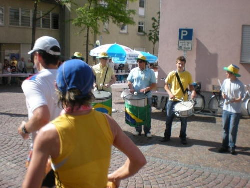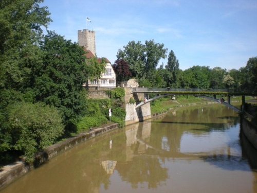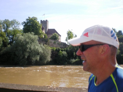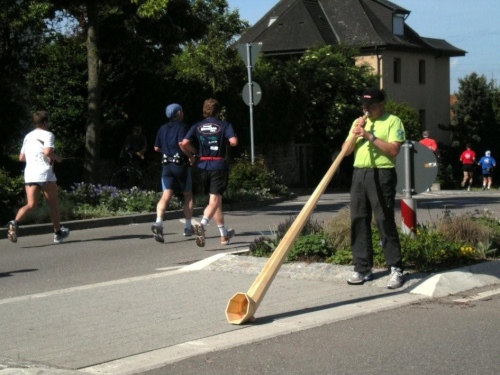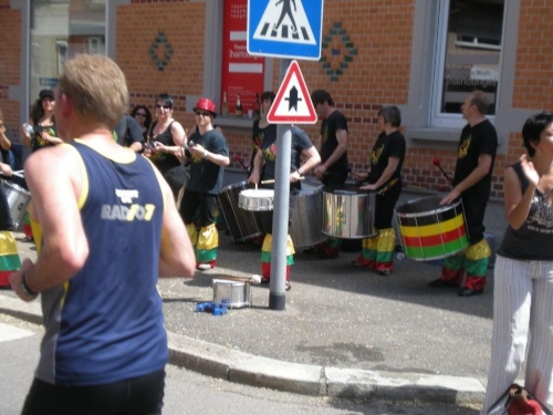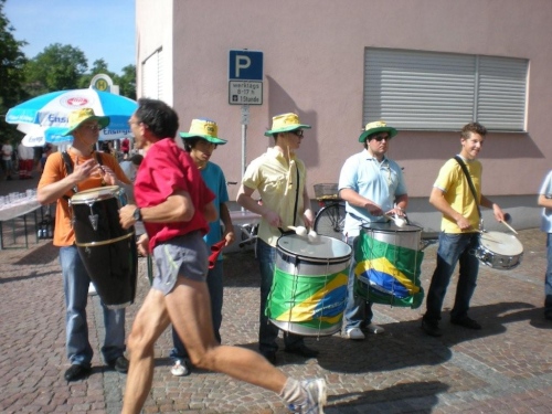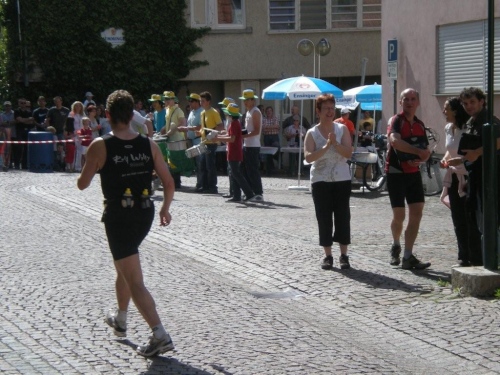 Beim nächsten Anstieg im Ort suchen sich alle die linke Straßenseite aus, welche im Schatten der Häuser liegt. Ich bin also nicht der Einzige, der offenbar das erste Mal in diesem Jahr wieder bei solchen Temperaturen läuft. Auch hier wird das Erreichen des Scheitelpunktes mit Alphornklängen belohnt, bevor es weiter – wieder abfallend - nach Lauffen geht. Die hier geänderte Streckenführung bringt heute den Vorteil eines zusätzlichen schattigen Abschnitts. Aus dieser kühlen Ruhe heraus geht es hoch ins Zentrum, wo heißer Samba und kraftvolle Rhythmen auf Stahl- und Plastikfässern geboten werden. Die Weinverkostung auf der alten Neckarbrücke überlasse ich anderen und widme mich stattdessen dem Stadtpanorama.