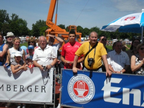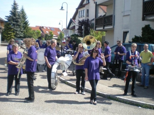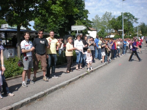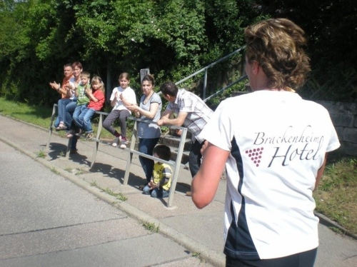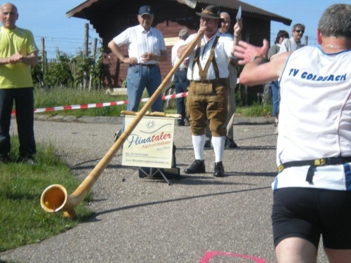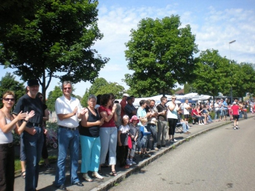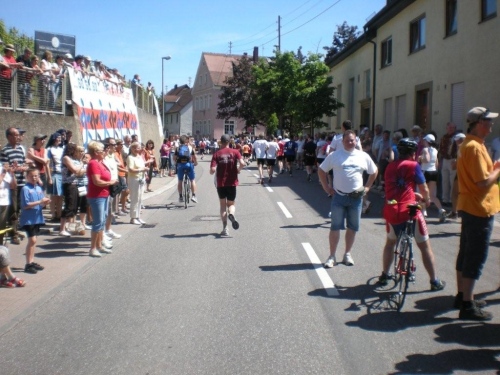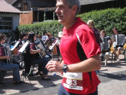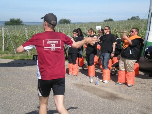 Ein Stück nach Lauffen geht es über einen der geänderten Streckenabschnitte nach Meimsheim. Vom Ortseingang an werden wir immer wieder von kleineren, dort wohnhaften Zuschauergruppen ermuntert, bevor wir am Sportgelände des TSV zünftig begrüßt werden, obwohl in den Partituren der Musikanten des Fanfarencorps Meimsheim 2000 e.V. im Moment nur Pausenzeichen stehen. Ich fühle ich mich zwar im oberen Bereich der Betriebstemperatur, doch auch die Festwirtschaft kann mich nicht ködern, von der Strecke abzuweichen. Liebe Meimsheimer, ihr mögt zwar einen Angelhaken im Wappen haben, aber der Versuchung anzubeißen widerstehe ich!