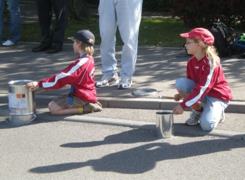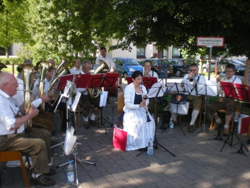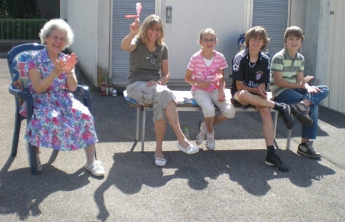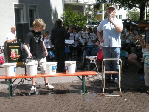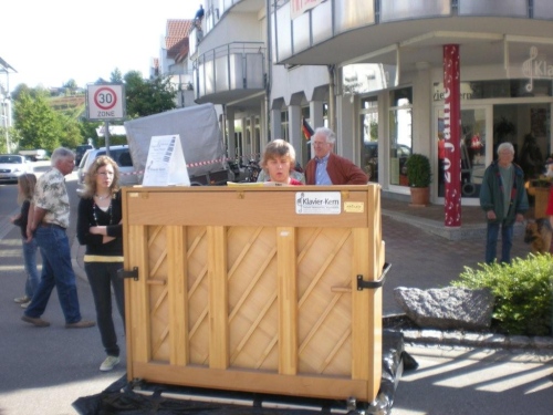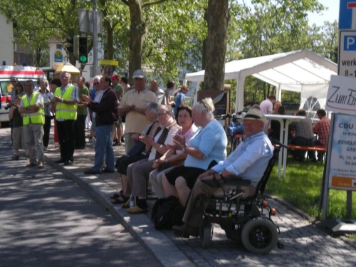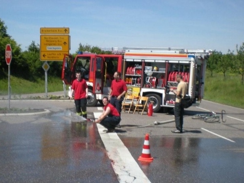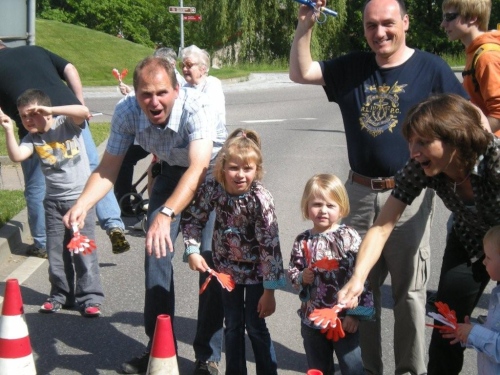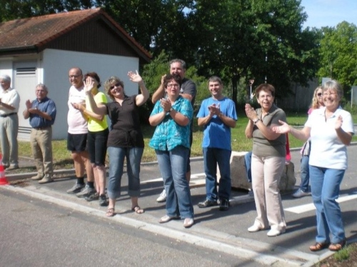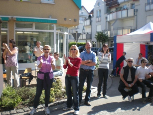 Auch in Flein geht die evangelische Kirchgemeinde heute „an die Hecken und Zäune“. Nach einer kurzen Andacht auf dem Rathausvorplatz widmet sich die Bevölkerung dem „Marathon-Brunch“ der Fleiner Vereine, Geschäftsleute und Gemeinde. Allerdings gehört die Aufmerksamkeit zuerst einmal uns. Bis die Halbmarathonis vorbeikommen, geht dann gemütlich das eine oder andere Tässchen Kaffee die Kehle runter.