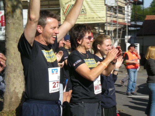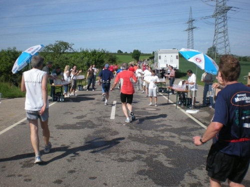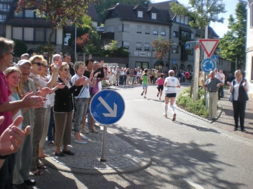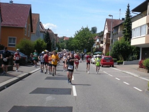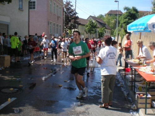 Auf den ersten drei Kilometern laufen wir im Schatten der Bäume, bevor wir im Stadtteil Sontheim erstmals richtig Bekanntschaft mit Anwohnern machen, die uns anfeuern. Nach fünf Kilometer steht der erste vollständig ausgerüstete Verpflegungsposten und wenig später geht es unter dem Applaus der Zuschauer aus dem Siedlungsgebiet heraus nach Flein.