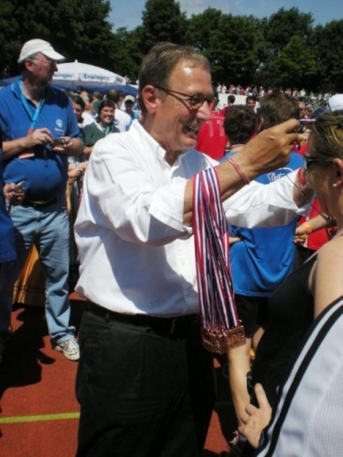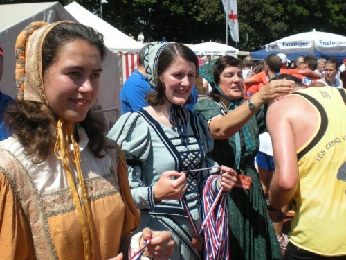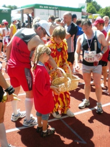 Über die Brücke, auf welcher der Schluss des Startfeldes vor knapp vier Stunden stand, geht es nochmals über die Startlinie und dann links ab, hinein ins Frankenstadion. Die rund 650 Marathonis gehen in der Masse der fast 4500 Halbmarathonis ziemlich unter. Mir ist es egal, dass ich nicht so beachtet werde, ich habe im Ziel schon besser ausgesehen. Obwohl, muskulär ist alles in Ordnung, mir fehlt es einfach an Kraft. Stehvermögen brauchen auch der Oberbürgermeister und die drei Käthchen, die jedem, der es geschafft hat, die Medaille überreichen.