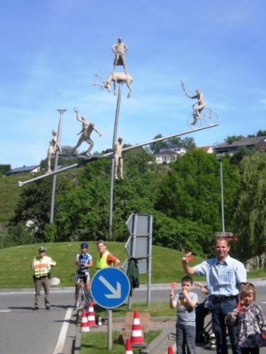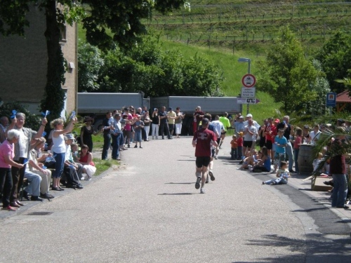 Bevor ich es hinunter nach Talheim krachen lassen kann, lässt es die Guggenmusik-Kapelle noch krachen. Kaum säumen Wohnhäuser die Straße, erhalten wir wieder Zuspruch von den Anwohnern. Das Ortswappen von Thalheim sieht fast bedrohlich aus, mit dem hineinragenden Arm und dem Rebmesser in der Hand, ich fürchte aber nichts, denn erstens kenne ich das Rebmesser aus dem Wappen meiner Wohngemeinde, zweitens fühle ich mich trotz der zunehmenden Wärme noch halbwegs fit, und drittens sitzen die Talheimer friedlich beim Frühschoppen neben der Strecke.