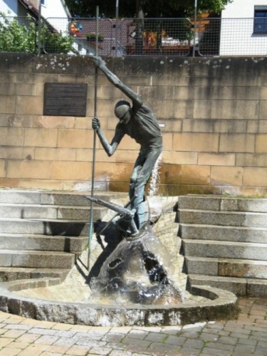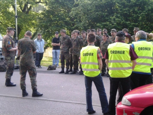 Heraldisch gesehen ist die neue Streckenführung durch den Stadtteil Dürrenzimmern nicht unbedingt besser. Das in Blau gelegte goldene Beil und die beiden goldenen Sterne interpretiere ich als Warnung vor dem Hammermann, der heute gar mit der Axt zuschlagen wird. Wenn nicht, dann steht da immer noch die Botschaft „per aspera ad astra“. Die Sterne haben heute die Form einer Medaille, die nur dem umgehängt wird, der ins Ziel kommt. Immerhin, die Unterstützung an der Strecke ist da und sie hilft.