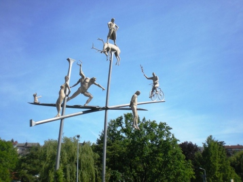 Tierisch geht es am Ausgang der Ortschaft zu. Die Skulptur im Kreisverkehr kündigt an, dass ich bald einmal wie der Esel am Berg stehen werde. So weit kommt es nicht, denn vorher leiste ich dem Aufruf „Quäl dich du S…“ Folge und trabe die erste größere Steigung auf den Haigern hoch, wo mich Alphornklang empfängt.