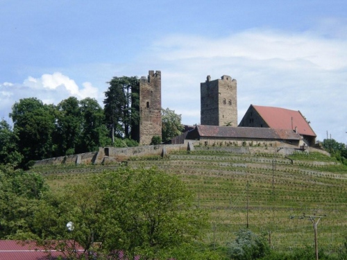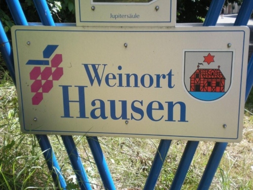 Weiter geht es nach Hausen an der Zaber. Auch hier ist Volksfeststimmung und wird die Gelegenheit zur Weinverkostung geboten. Wohl dem, der dies bei dieser Wärme verträgt. Ich würde nach dem ersten Schluck nur noch Sterne sehen und müsste ins Haus getragen werden. Diese Warnung wird mir am Ortseingang mit dem Wappen deutlich gegeben.