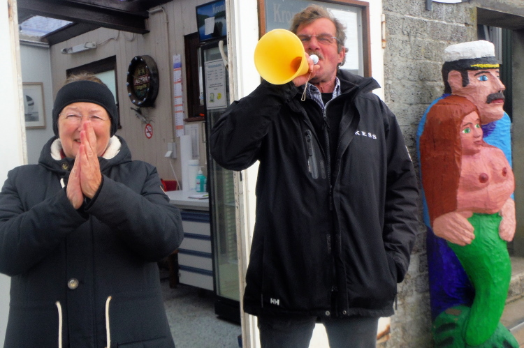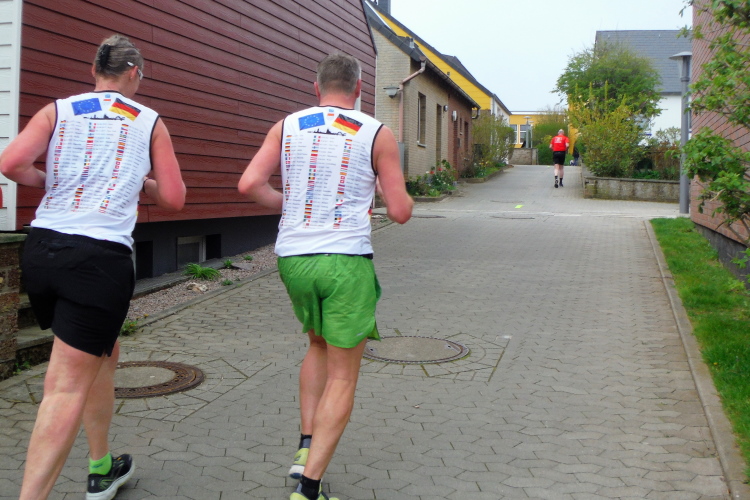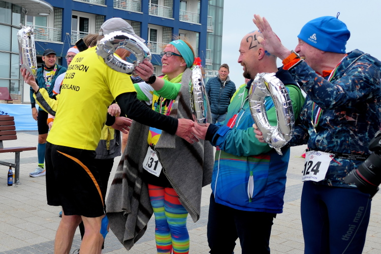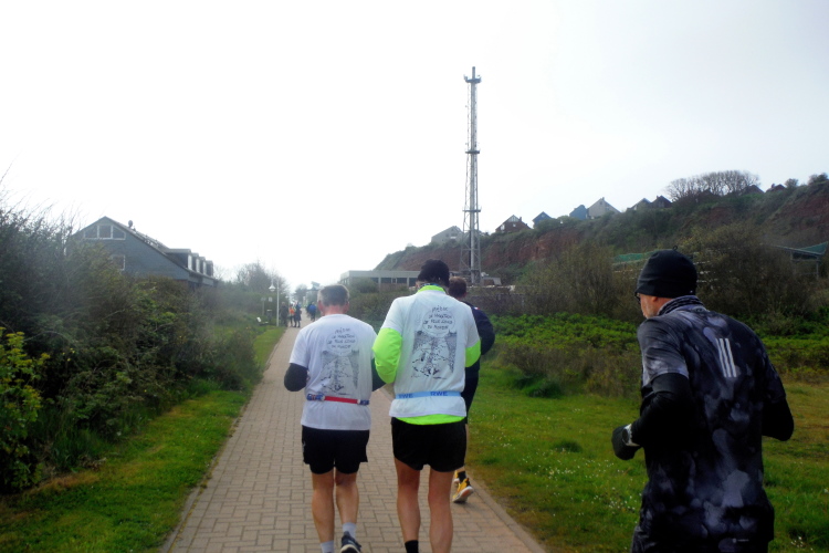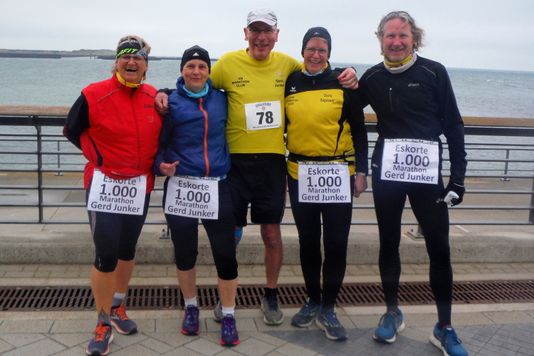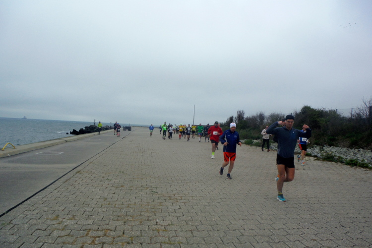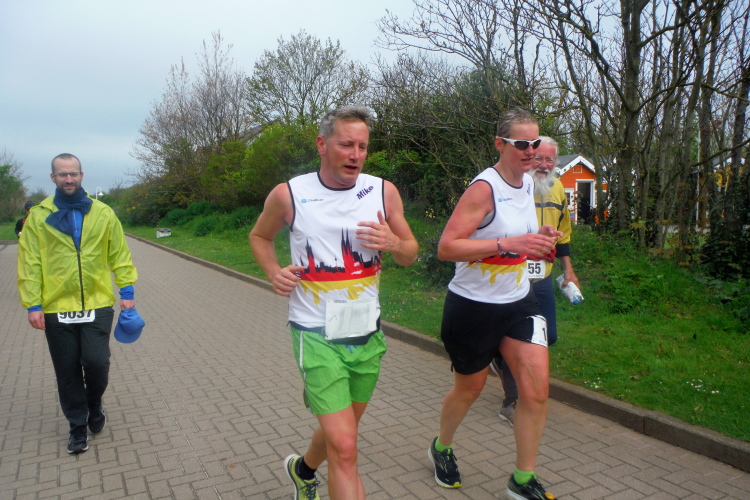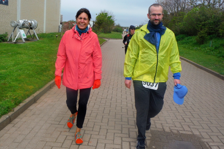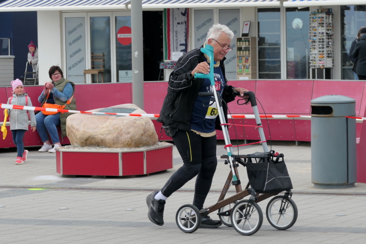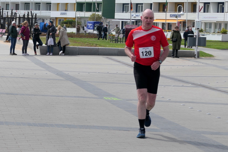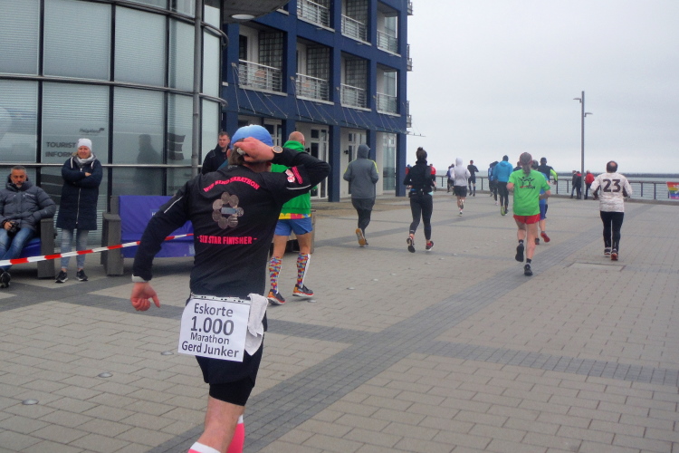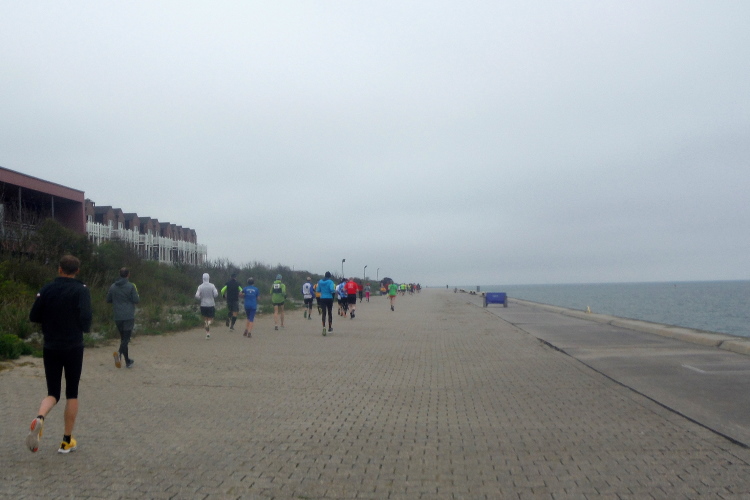 Jürgen und Rolf muss ich derweil langsam ziehen lassen. Vor und hinter mir bekomme ich Elke und Mike mehrfach vor die Linse. Für seine Jacke wird es Mike langsam zu warm, obwohl sich die Sonne erst langsam durchsetzt. Jetzt kann ich auf der Rückseite ihrer Shirts ihre Laufvita studieren. Beeindruckend und Anlass für ausgedehnte Gespräche. Gemeinsam beginnen wir die dritte Runde. Beim Abbiegen von der Promenade zum Strand trötet ein treuer Zuschauer. Wie ich erfahre, feuert er schon seit Jahren die Läuferschar an und wird auch heute bis zum Schluss nicht nachlassen.