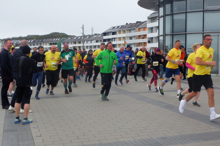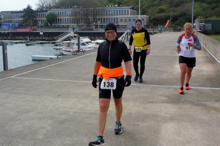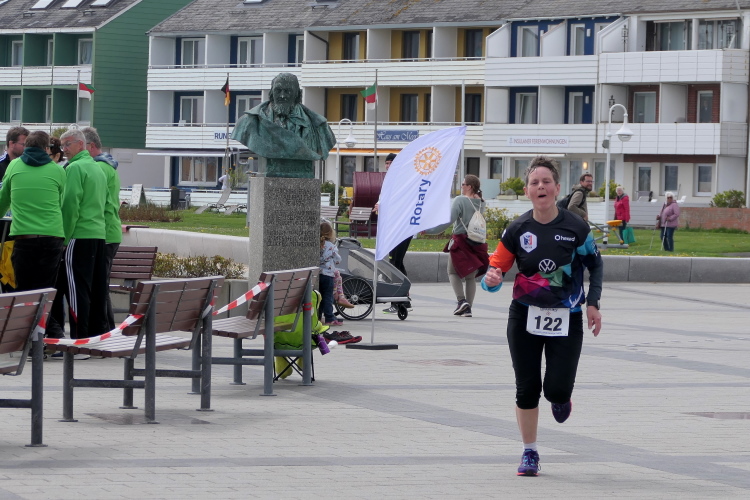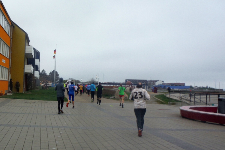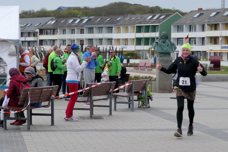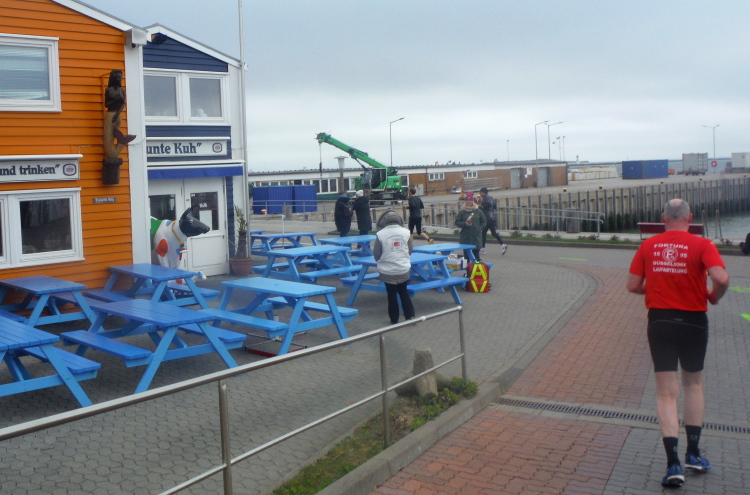 Aufgrund meiner bunten Socken werde ich bei der langen Anna freundlich weiter auf die Reise geschickt. Die Zuschauerin, die von einer Liege den Lauf beobachtet, beendet ihre Mission. Der Wind ist wohl zu frisch. Das Publikum wechselt, die Fähre ist angekommen und die Tagestouristen füllen die Strecke. Artig machen sie den Läufern Platz, so dass ich weiter ungehindert vorankomme. Angenehm flach ist die Runde am Hafen und über die Kurpromenade. Ich schließe zu Beginn der vorletzten Runde zu Doris und Sylvia auf. Gerade als ich an unserem Hotel vorbeikomme, in Gedanken bei Silke bin, stolpere ich und lege eine gekonnte Flugrolle auf den Beton. Leicht besorgte Nachfragen meiner Mitläuferinnen kann ich beruhigend beantworten, alles gut gegangen. Nur meine Kamera hat einen leichten Schlag abbekommen, weshalb ich sie jetzt endgültig einstecke.