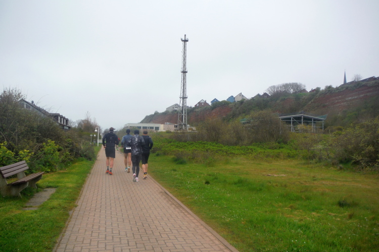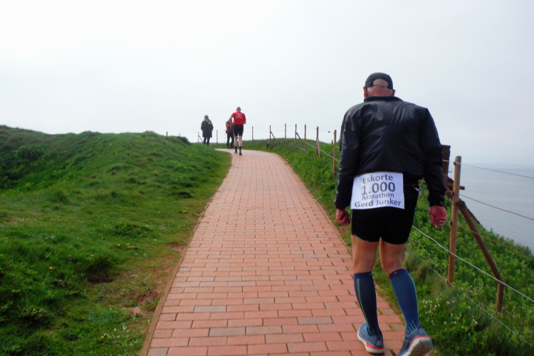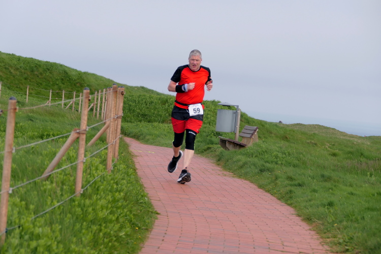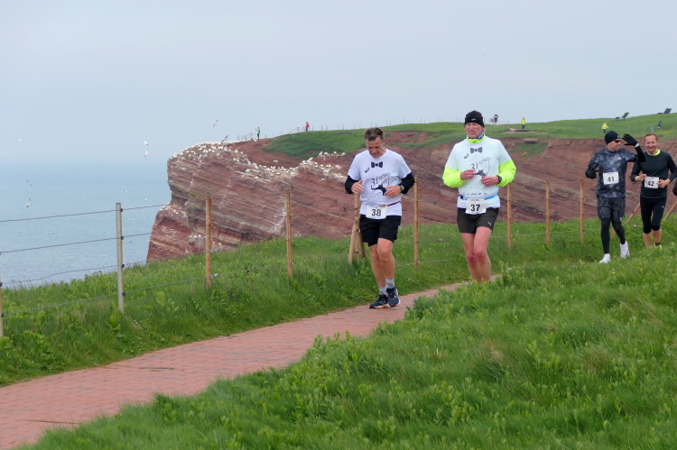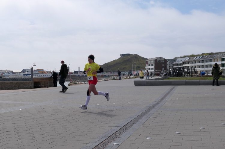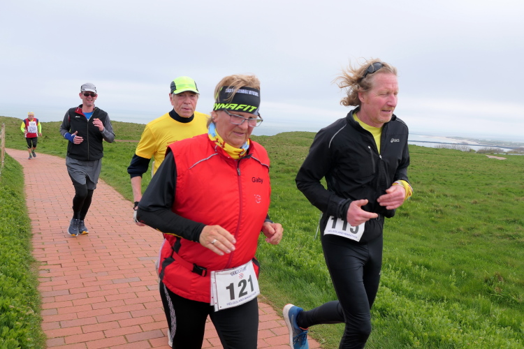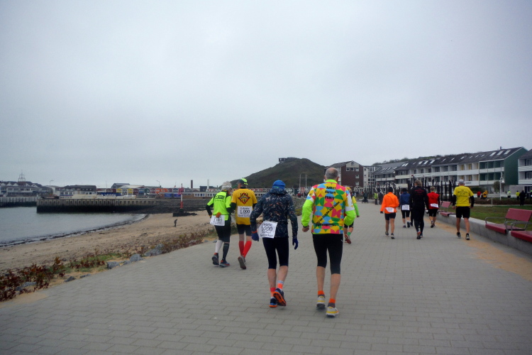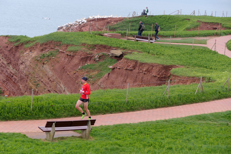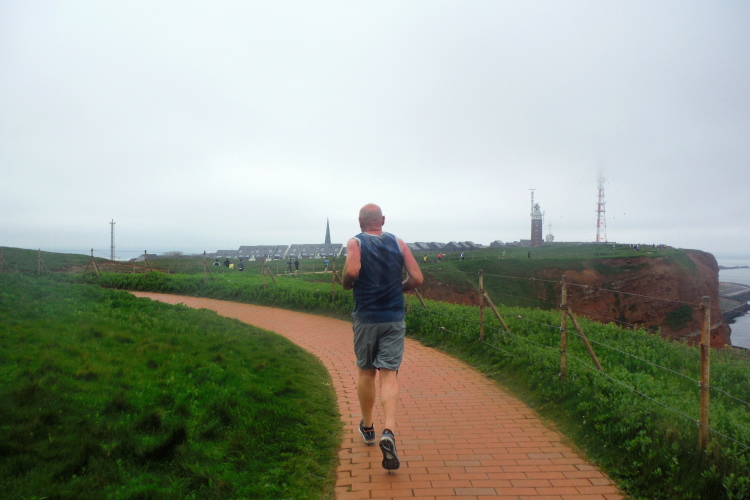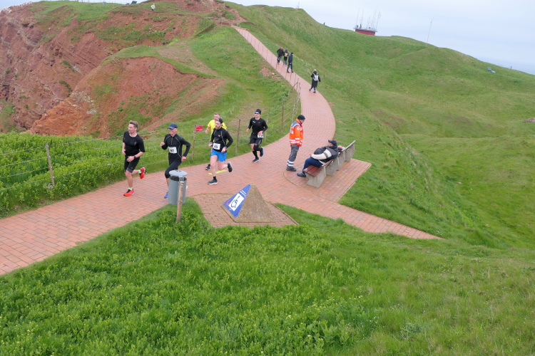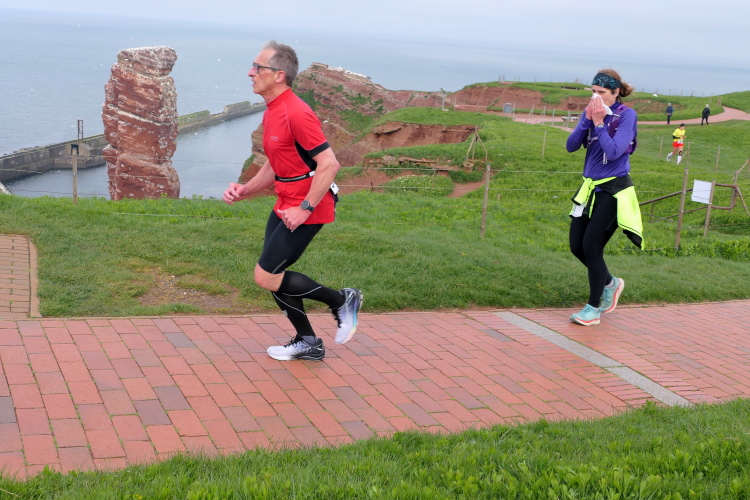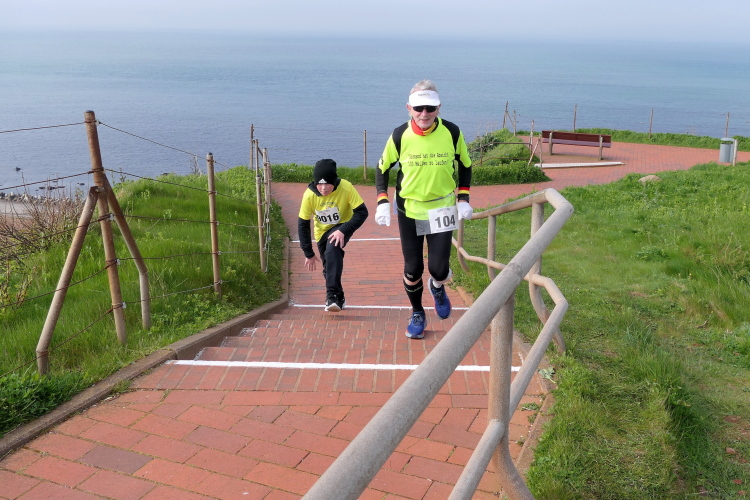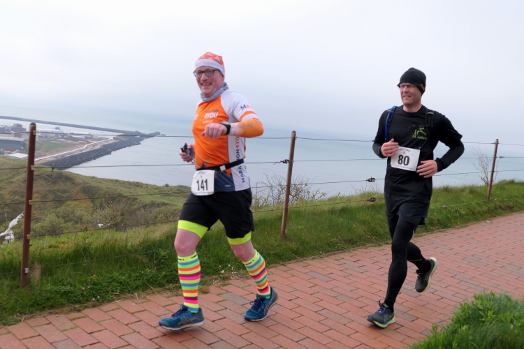 Das Ziel ist nah, aber doch noch fern. 5 weitere Runden warten. Die Driburger erspähe ich auf Runde 4 vor meinem Hotel und ja, laufen kann ich noch, auch wenn ich Elke und Mike langsam ziehen lassen muss. Der Düsenjäger wird auch nicht leichter. Gemeinsam mit Holger geht es hinauf. Zumindest die ersten beiden Runden wollte er hier hoch laufen, jetzt hat er es bereits zum 4. Mal geschafft. Nun gut, er hat ja auch reichlich Erfahrung, denn seit der ersten Ausgabe ist er ununterbrochen mit dabei Helgoland zu umrunden. Die Strecke hat derweil immer mal wieder leicht variiert. Unter Einbeziehung der Mole war sogar ein 4-Runden-Kurs möglich, was zumindest die zu bewältigenden Höhenmeter deutlich reduziert hat.