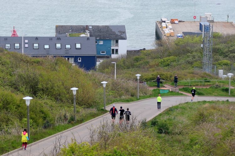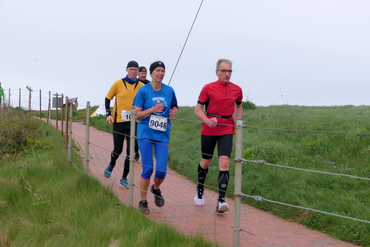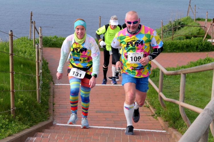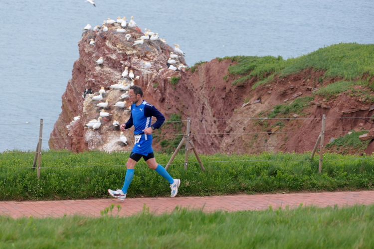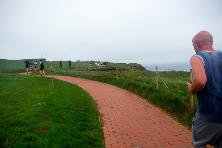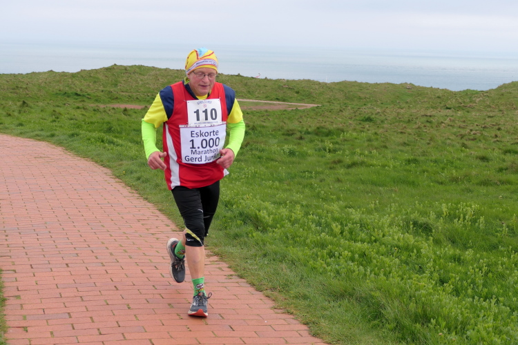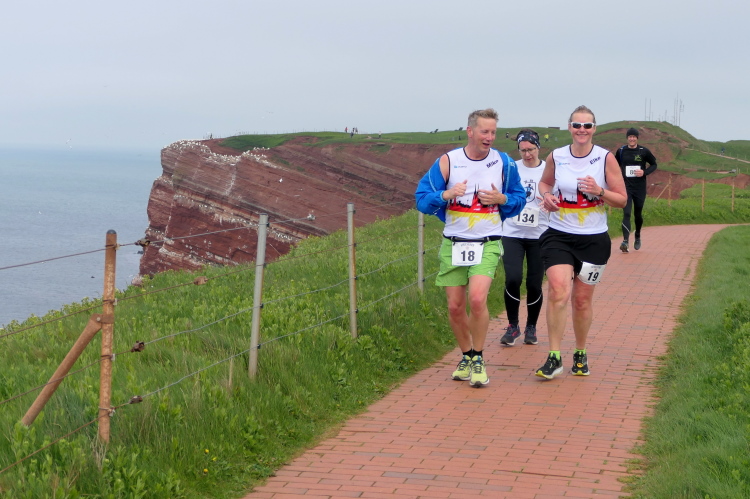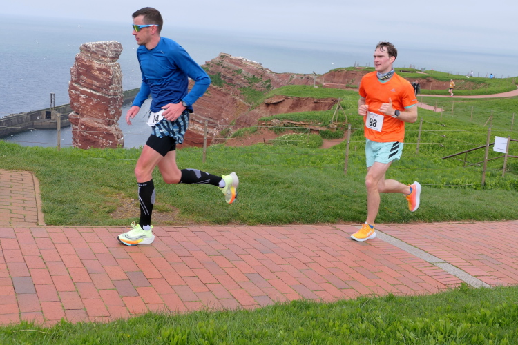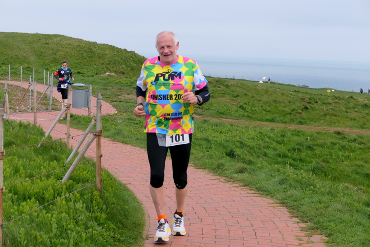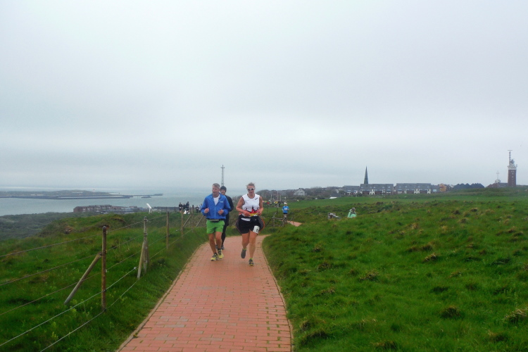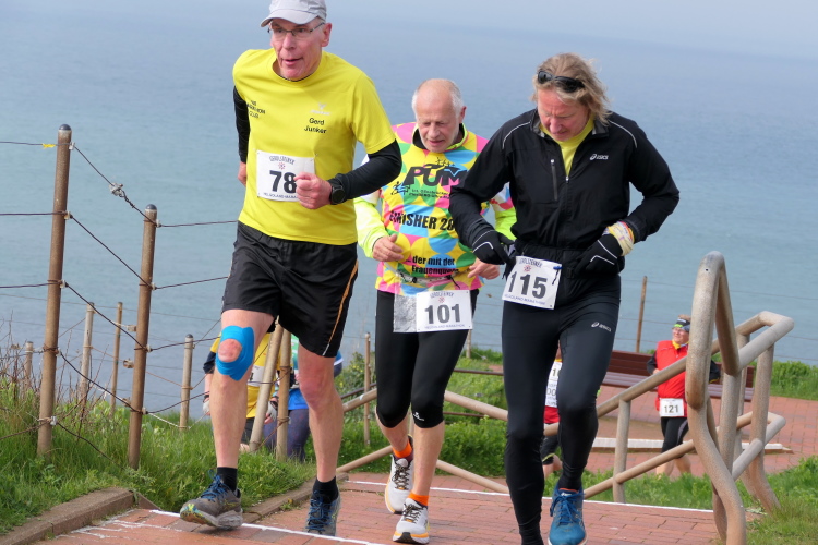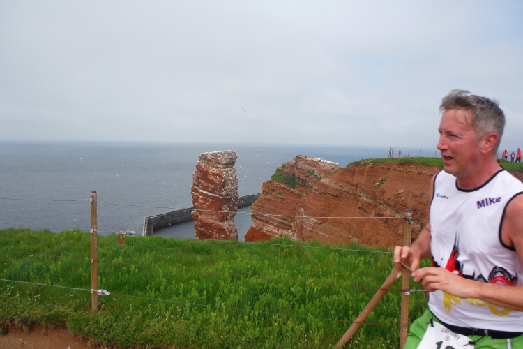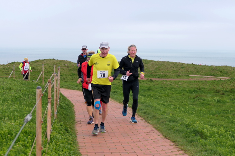 Das Ziel ist nah, aber doch noch fern. 5 weitere Runden warten. Die Driburger erspähe ich auf Runde 4 vor meinem Hotel und ja, laufen kann ich noch, auch wenn ich Elke und Mike langsam ziehen lassen muss. Der Düsenjäger wird auch nicht leichter. Gemeinsam mit Holger geht es hinauf. Zumindest die ersten beiden Runden wollte er hier hoch laufen, jetzt hat er es bereits zum 4. Mal geschafft. Nun gut, er hat ja auch reichlich Erfahrung, denn seit der ersten Ausgabe ist er ununterbrochen mit dabei Helgoland zu umrunden. Die Strecke hat derweil immer mal wieder leicht variiert. Unter Einbeziehung der Mole war sogar ein 4-Runden-Kurs möglich, was zumindest die zu bewältigenden Höhenmeter deutlich reduziert hat.