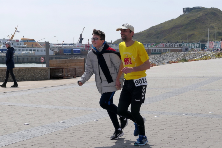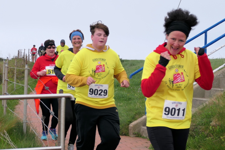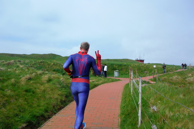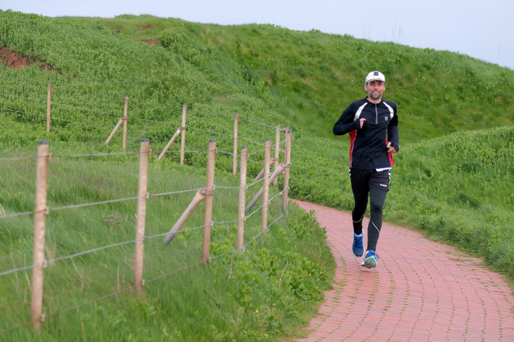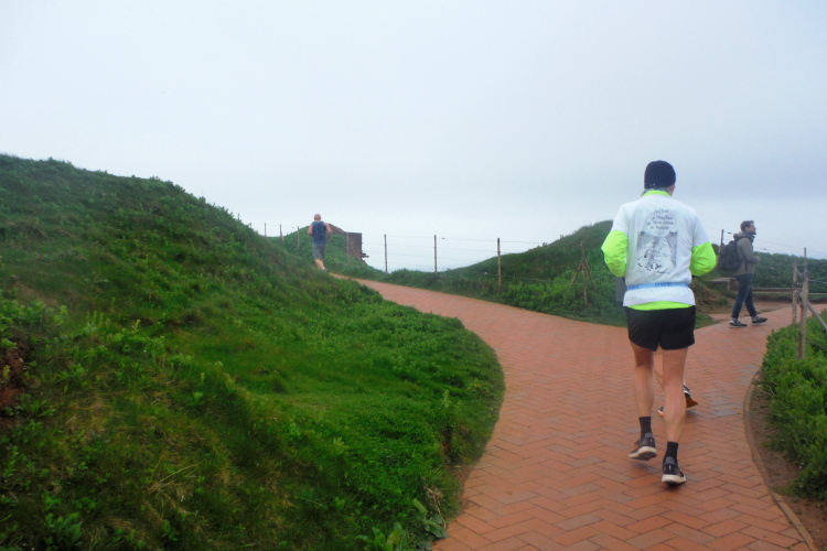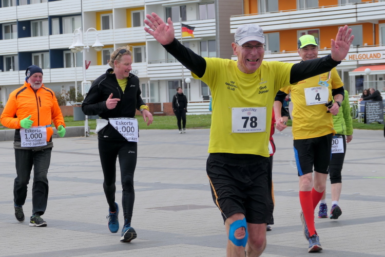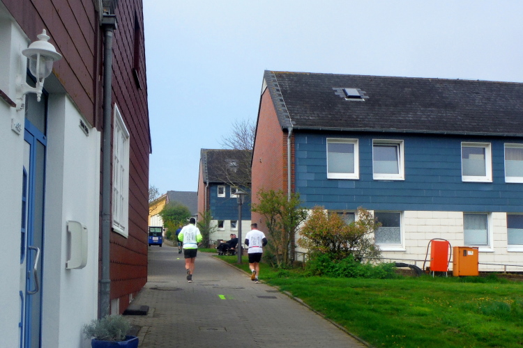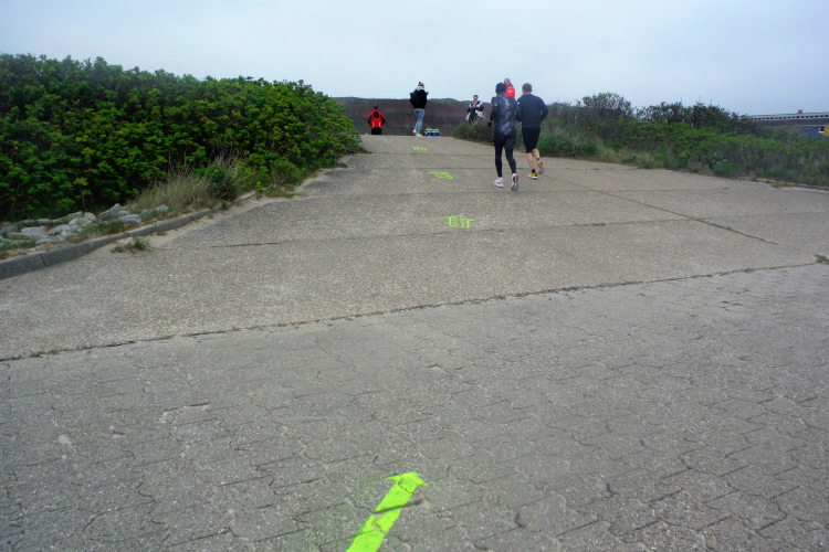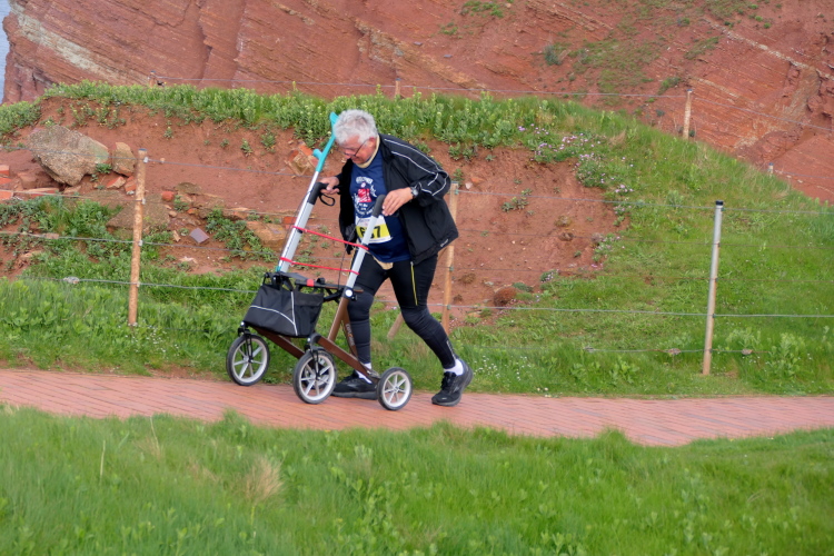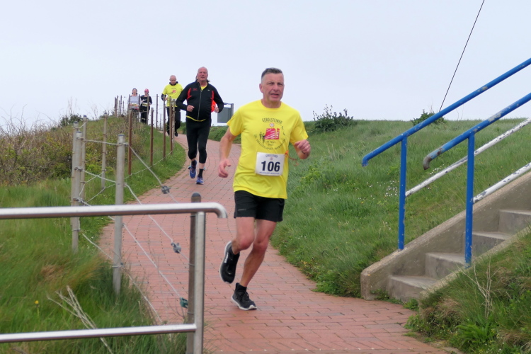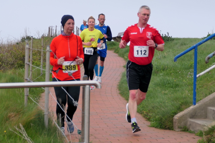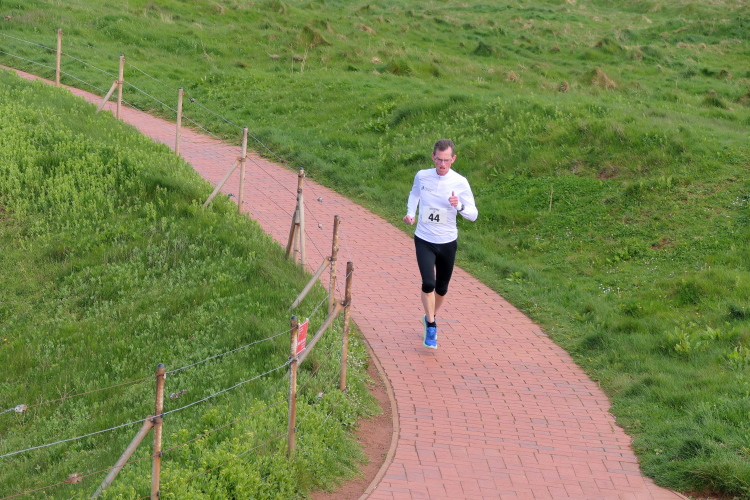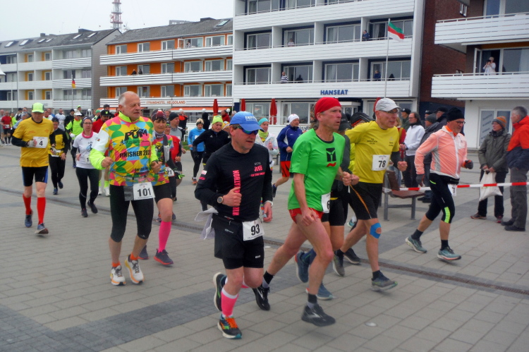 Das Ziel ist nah, aber doch noch fern. 5 weitere Runden warten. Die Driburger erspähe ich auf Runde 4 vor meinem Hotel und ja, laufen kann ich noch, auch wenn ich Elke und Mike langsam ziehen lassen muss. Der Düsenjäger wird auch nicht leichter. Gemeinsam mit Holger geht es hinauf. Zumindest die ersten beiden Runden wollte er hier hoch laufen, jetzt hat er es bereits zum 4. Mal geschafft. Nun gut, er hat ja auch reichlich Erfahrung, denn seit der ersten Ausgabe ist er ununterbrochen mit dabei Helgoland zu umrunden. Die Strecke hat derweil immer mal wieder leicht variiert. Unter Einbeziehung der Mole war sogar ein 4-Runden-Kurs möglich, was zumindest die zu bewältigenden Höhenmeter deutlich reduziert hat.