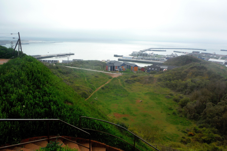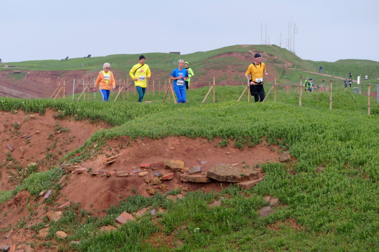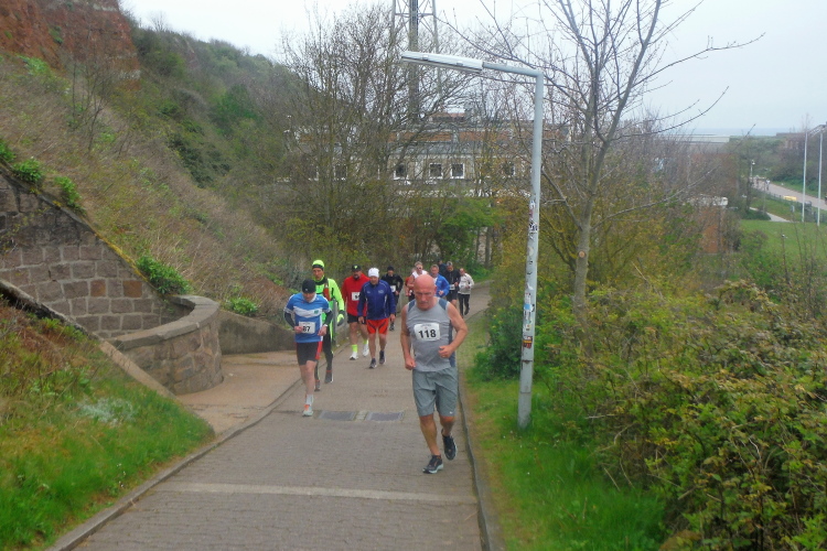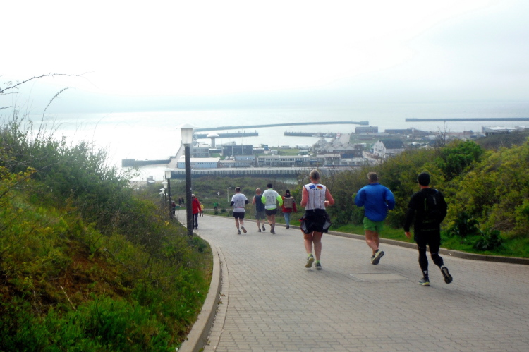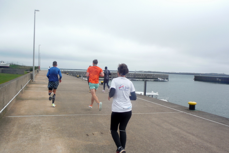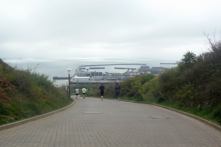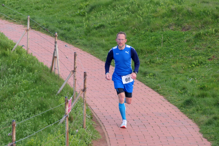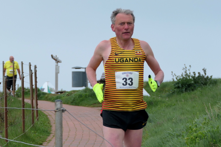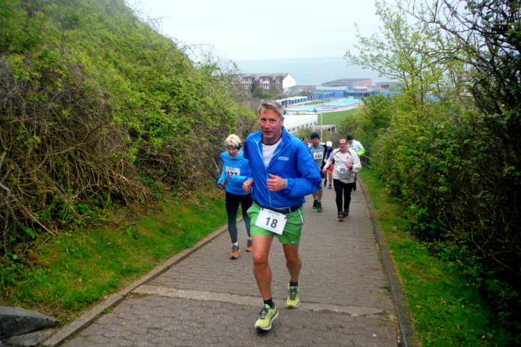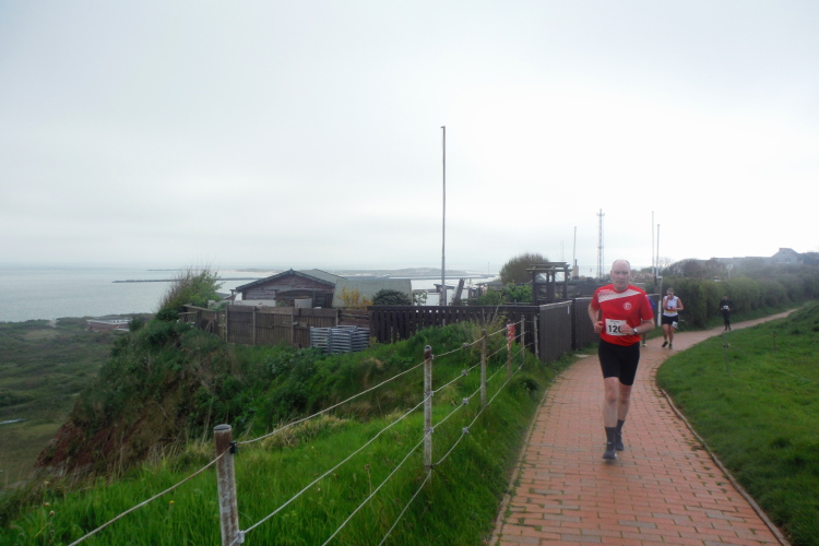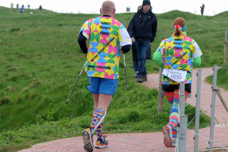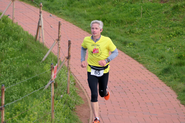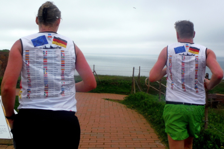 Das Ziel ist nah, aber doch noch fern. 5 weitere Runden warten. Die Driburger erspähe ich auf Runde 4 vor meinem Hotel und ja, laufen kann ich noch, auch wenn ich Elke und Mike langsam ziehen lassen muss. Der Düsenjäger wird auch nicht leichter. Gemeinsam mit Holger geht es hinauf. Zumindest die ersten beiden Runden wollte er hier hoch laufen, jetzt hat er es bereits zum 4. Mal geschafft. Nun gut, er hat ja auch reichlich Erfahrung, denn seit der ersten Ausgabe ist er ununterbrochen mit dabei Helgoland zu umrunden. Die Strecke hat derweil immer mal wieder leicht variiert. Unter Einbeziehung der Mole war sogar ein 4-Runden-Kurs möglich, was zumindest die zu bewältigenden Höhenmeter deutlich reduziert hat.