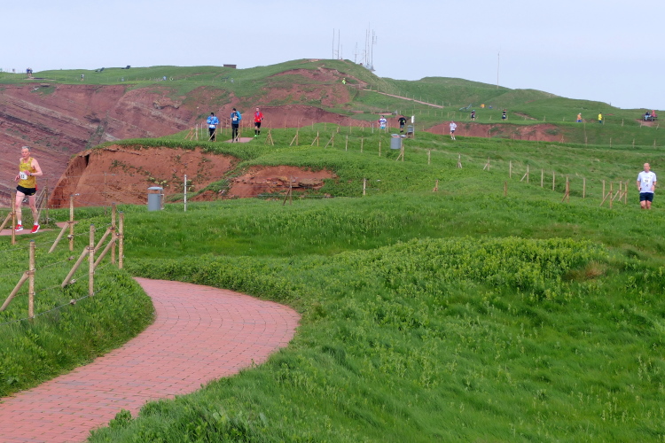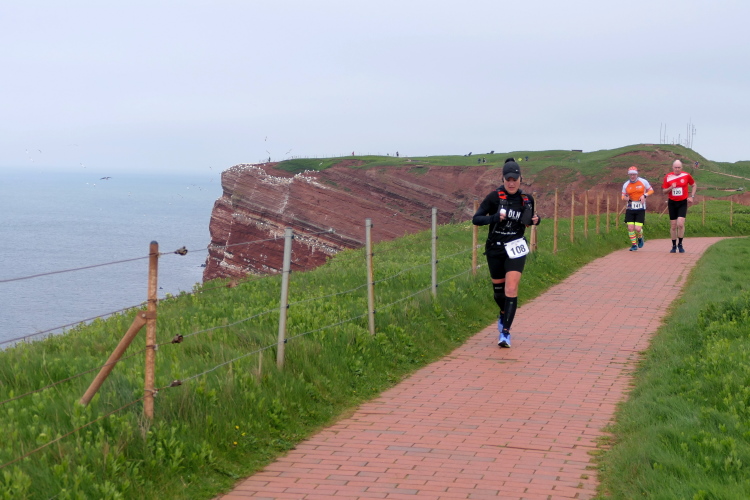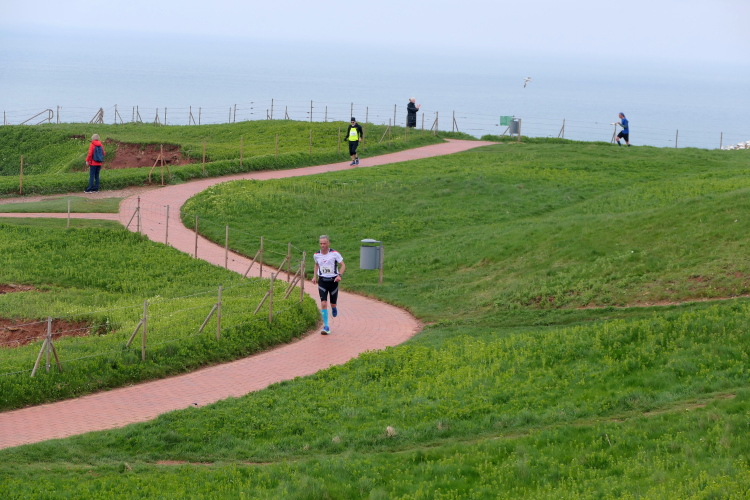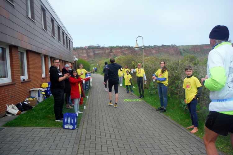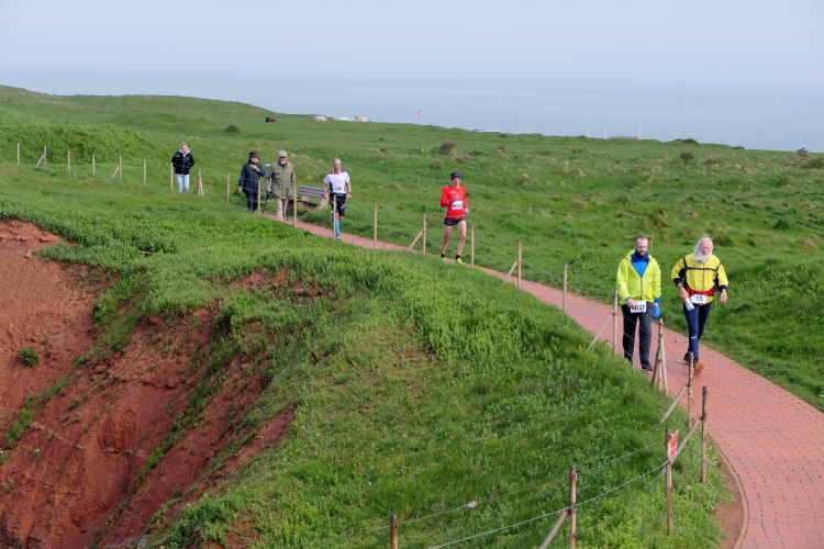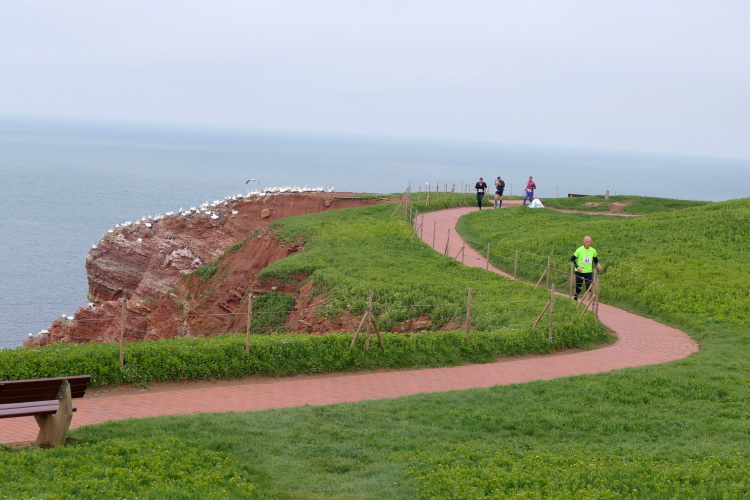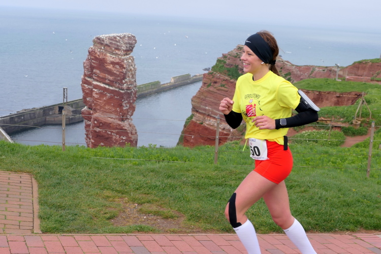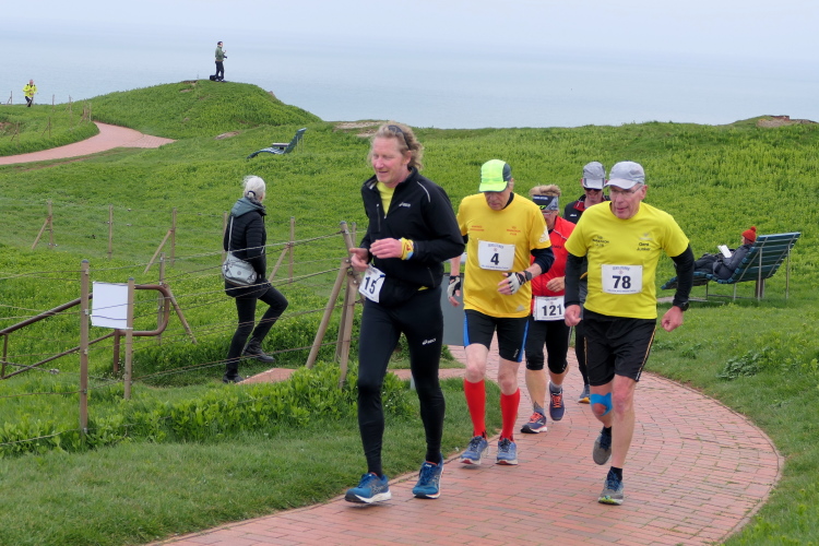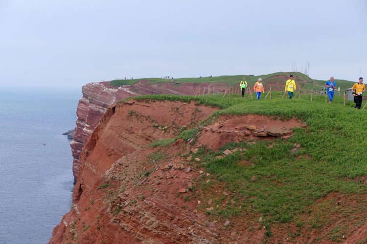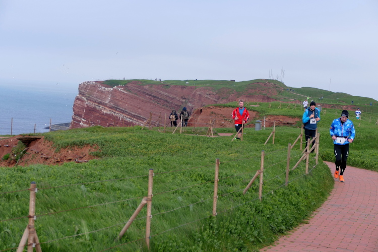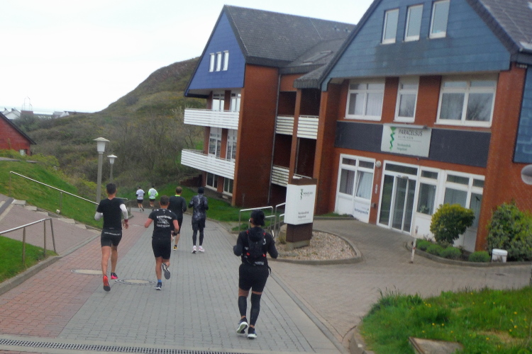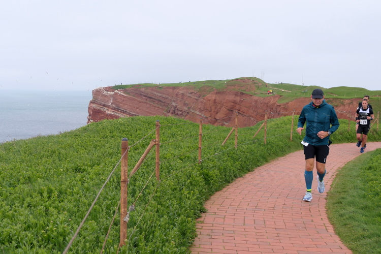 Gemeinsam laufen wir über das Oberland zur langen Anna. Bis 1860 verband sie noch eine Natursteinbrücke mit der Insel. Heute grüßt sie deutlich spektakulärer als einsamer Fels. Nach einer scharfen Linkskurve bläst uns der Wind von Süden entgegen. Bei bedecktem Himmel hält sich seine Stärke jedoch in Grenzen. Nach leichtem Auf und Ab erreichen wir am Ende des Klippenweges die dritte Verpflegungsstation, bevor uns der Weg steil nach unten vorbei an der örtlichen Klinik zurück zur Kurpromenade führt. Kurzweilig endet die erste Runde. Dieses war der erste Streich, doch der zweite folgt sogleich.