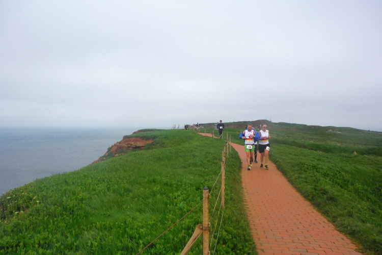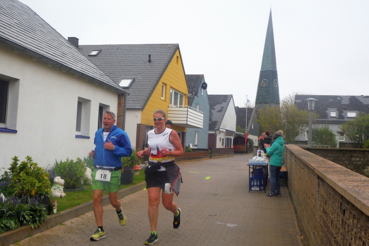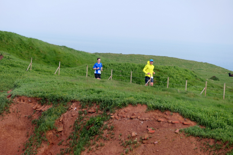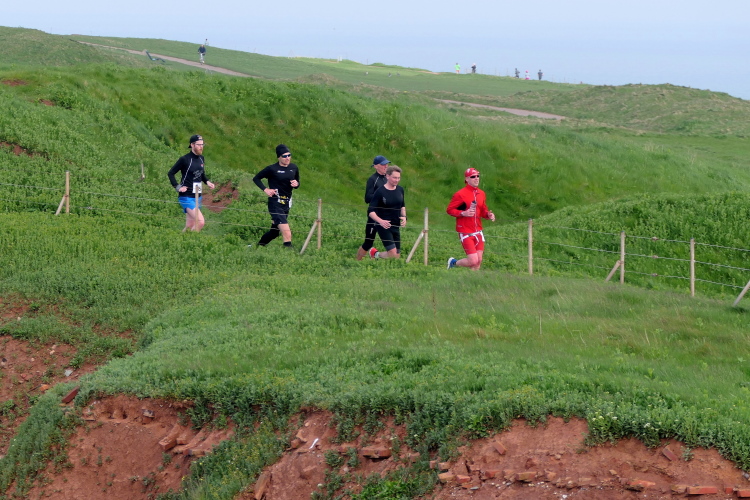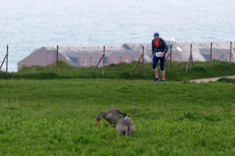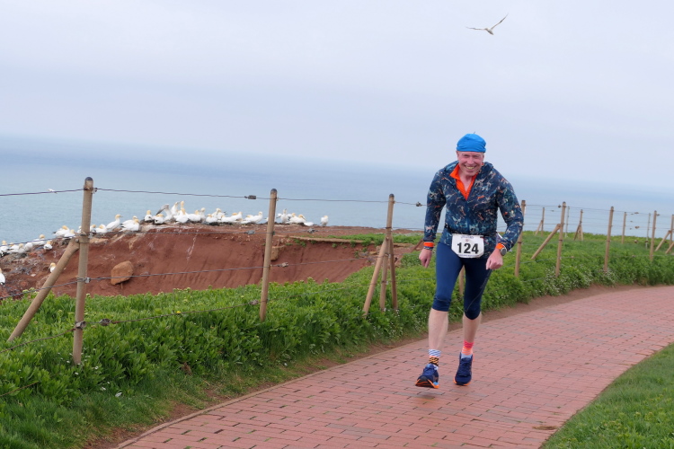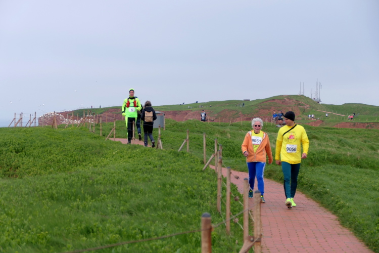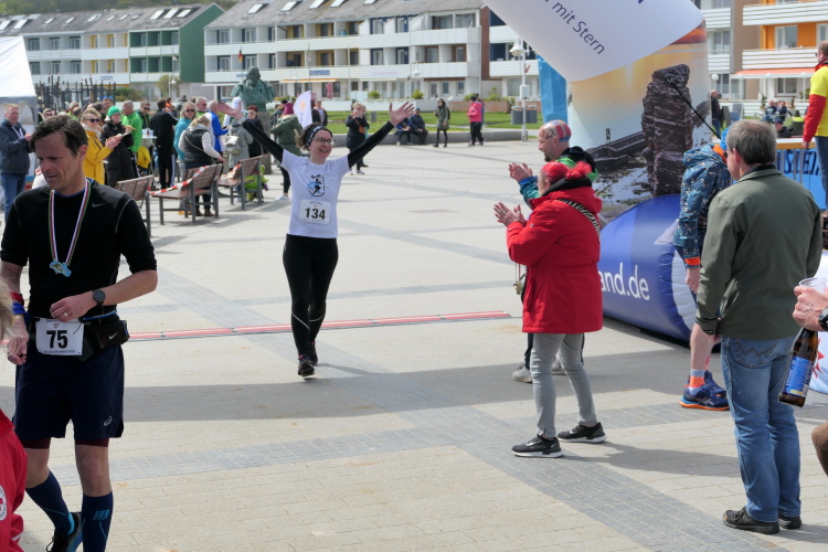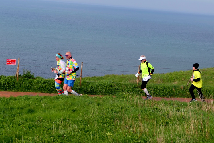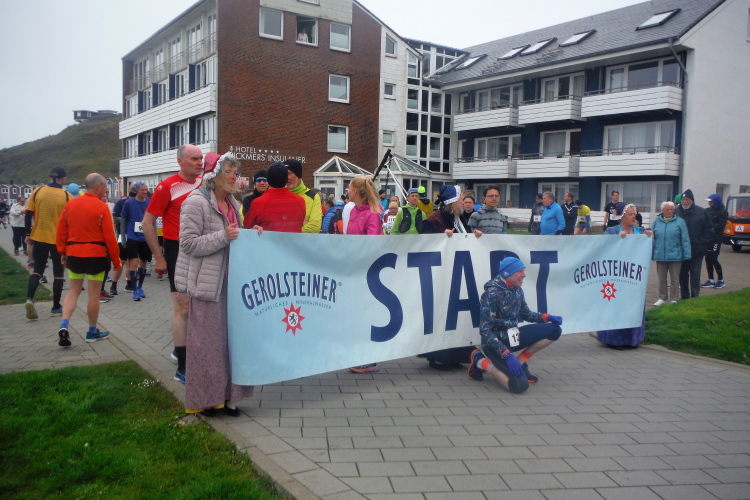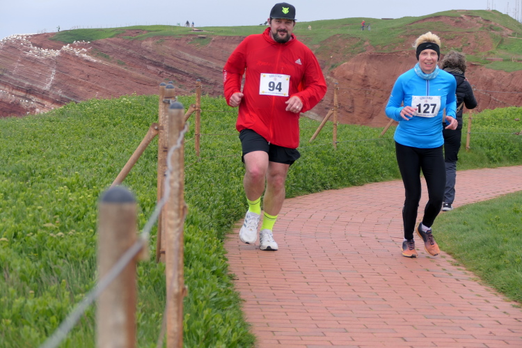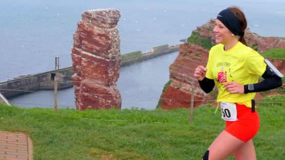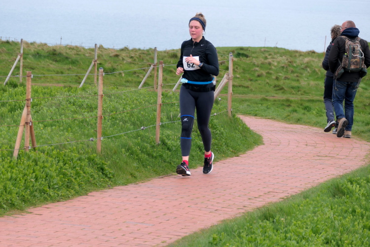 Gemeinsam laufen wir über das Oberland zur langen Anna. Bis 1860 verband sie noch eine Natursteinbrücke mit der Insel. Heute grüßt sie deutlich spektakulärer als einsamer Fels. Nach einer scharfen Linkskurve bläst uns der Wind von Süden entgegen. Bei bedecktem Himmel hält sich seine Stärke jedoch in Grenzen. Nach leichtem Auf und Ab erreichen wir am Ende des Klippenweges die dritte Verpflegungsstation, bevor uns der Weg steil nach unten vorbei an der örtlichen Klinik zurück zur Kurpromenade führt. Kurzweilig endet die erste Runde. Dieses war der erste Streich, doch der zweite folgt sogleich.