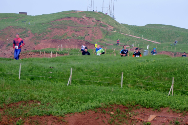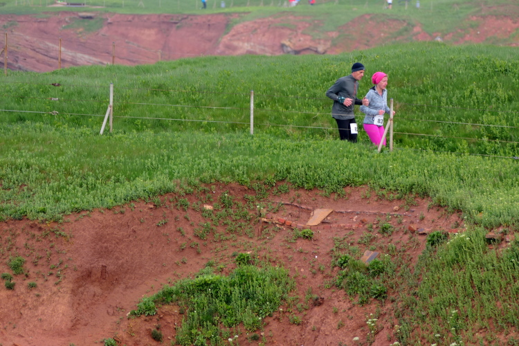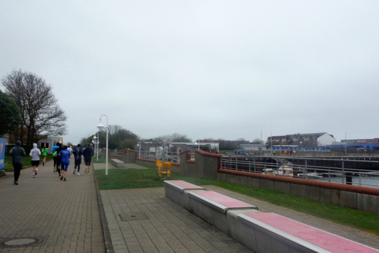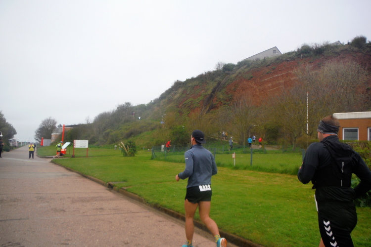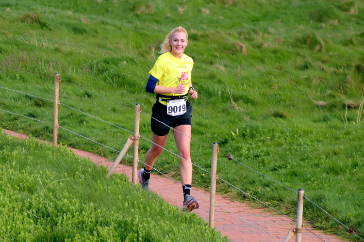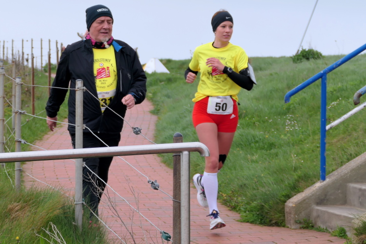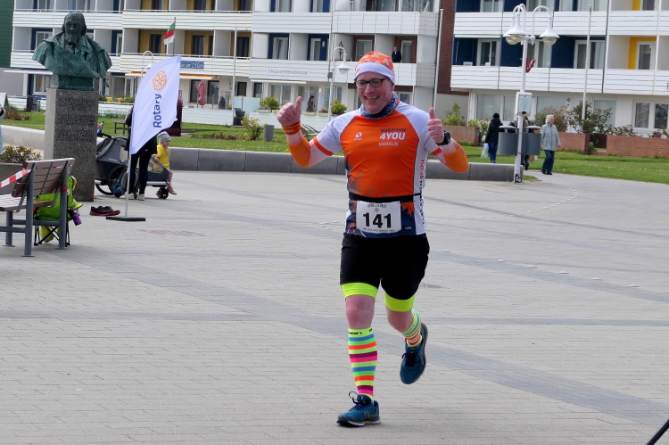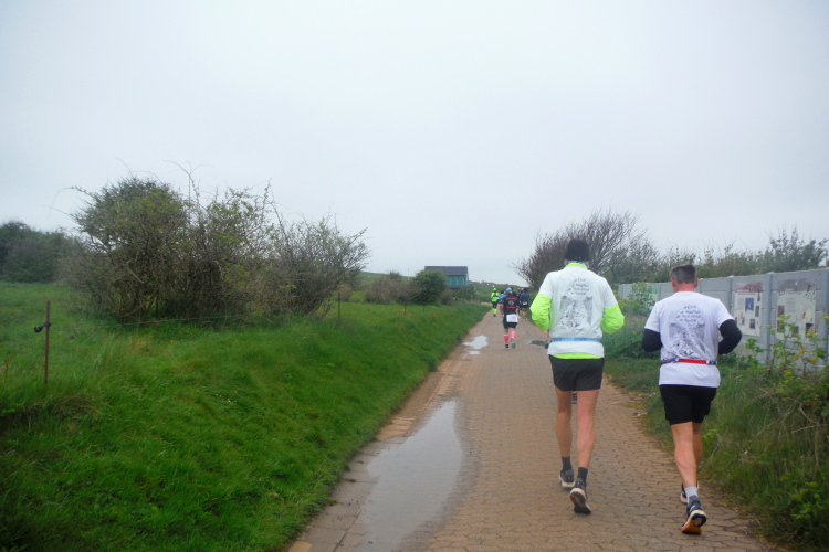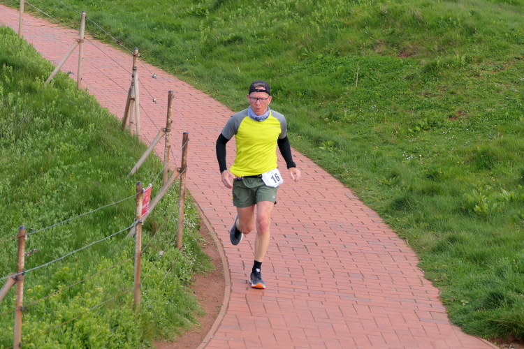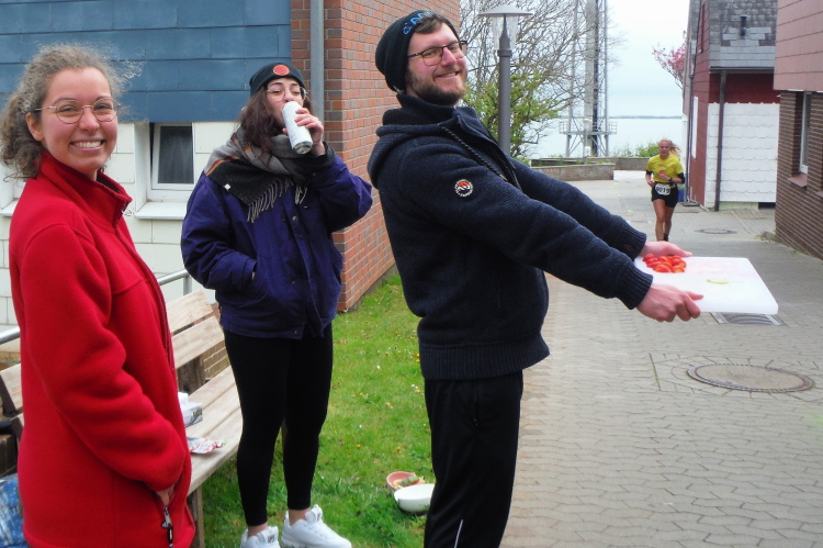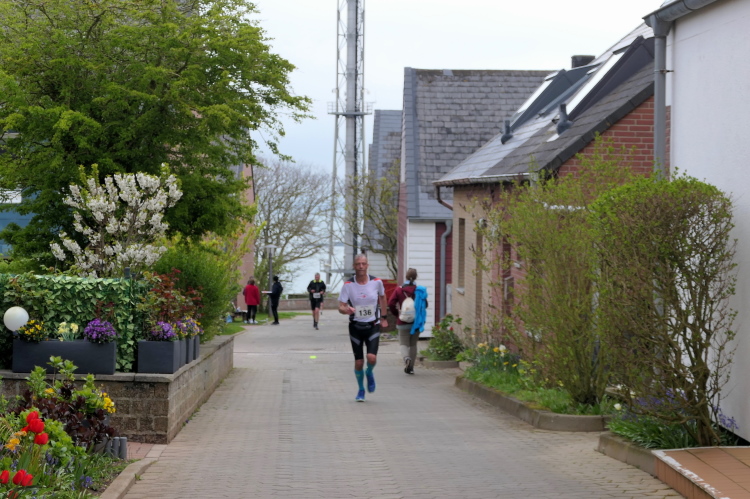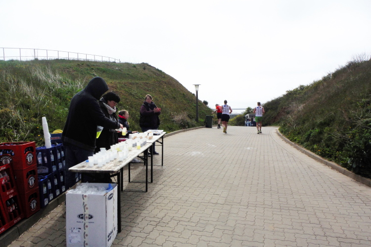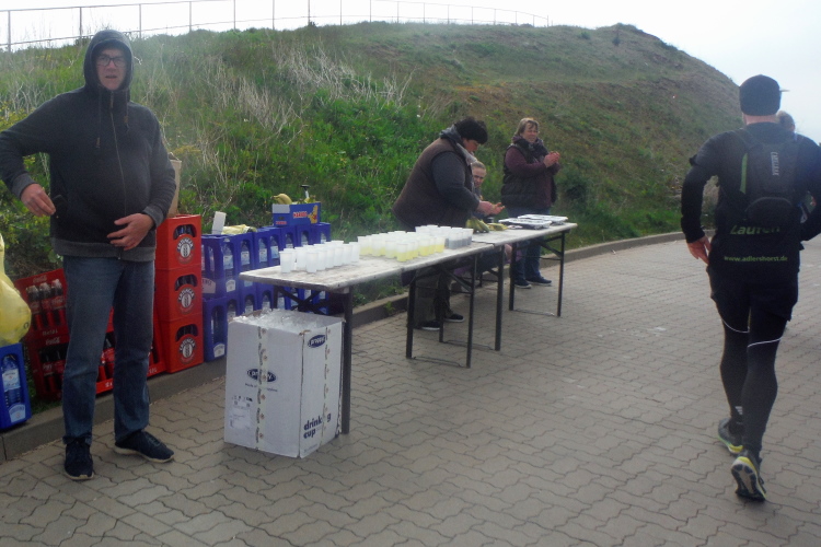Konzentration ist für die letzten Kilometer gefragt und ich möchte mich nicht weiter ablenken lassen. Obwohl, kurz hinter dem Deich, bei KM 1 der Runde wartet die nächste Verpflegungsstation. Die motivierten Helfer strecken mir unablässig die Getränke entgegen, feuern enthusiastisch an.. Aufmerksam werden die zurückgelegten Runden registriert und ja, einmal komme ich noch vorbei. Hinauf geht es den Düsenjäger, während sich auch die Sonne jetzt blicken lässt. Vorbei an den Kleingärten im Oberland am Rande der Klippen. Wenn auch nicht so schnell, doch dankbar erreiche ich die letzte Verpflegungsstation der Runde. Bevor es hinunter zum Hafen geht, werde diesmal ich als Revanche vom Helfer abgelichtet.