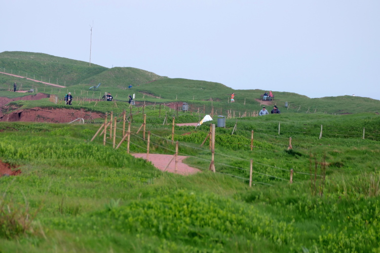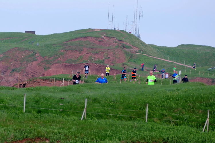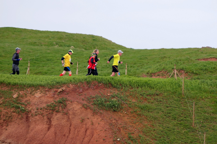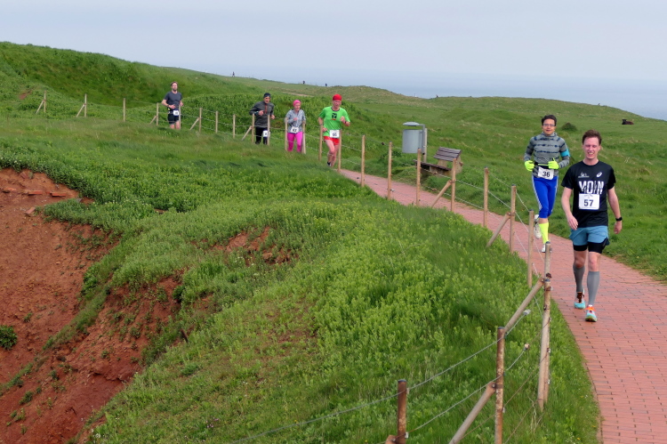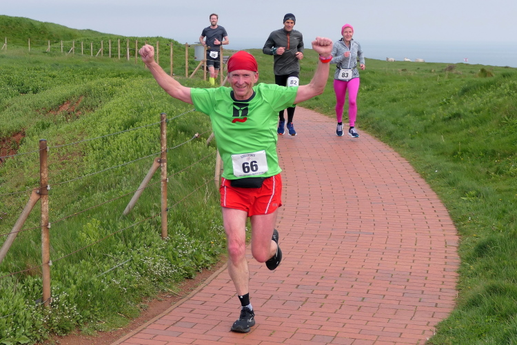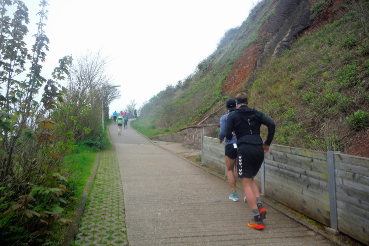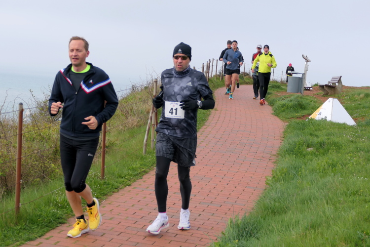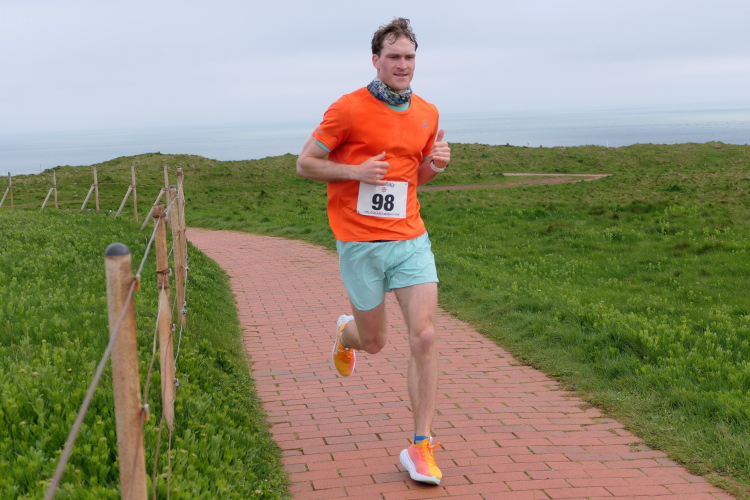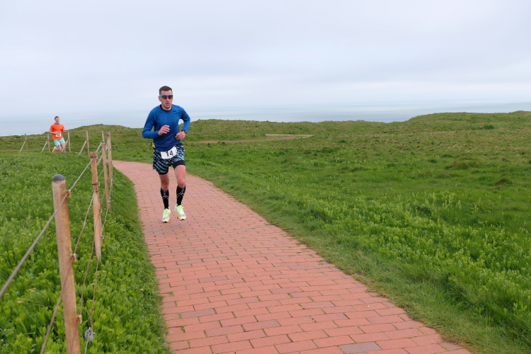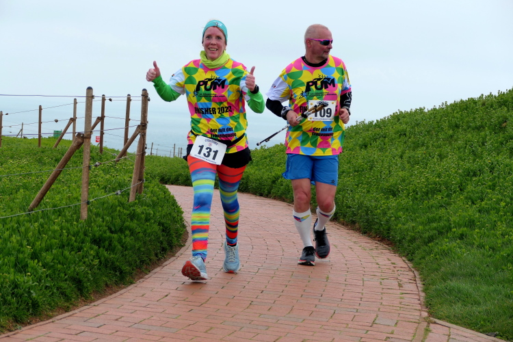 Die Strecke führt mich entlang der Kurpromenade in Richtung Ost-Nordost. Rechts abbiegend für eine Schleife um das James-Krüss-Museum laufe ich kurzfristig am Strand, ehe es zurück in Richtung Ort geht. Bevor ich diesen erreiche, gilt es erstmals den Düsenjäger zu erklimmen. Am oberen Ende erwartet mich der Lauftreff meines Heimatvereins und wundert sich, dass ich gehe und mir Zeit für Bilder nehme. Aber ich muss die Steigung sieben weitere Male meistern, da muss ich nicht gleich zu Beginn des Laufes meine Kraft verschwenden. Ein paar weitere Höhenmeter warten auf dieser Runde schließlich auch noch, wenn auch sanft verteilt. Bei KM 2 der Runde wartet bereits die zweite von 3 Verpflegungsstationen an der Schule. Ich bin oben angekommen und setze meinen Weg auf dem Klippenrundweg fort. Ich laufe zu Jürgen und Rolf auf. Ihre Shirts weisen sie als Teilnehmer des Medoc-Marathon aus. Auf den dort kredenzten süffigen Traubensaft müssen sie heute verzichten, aber es geht auch so.